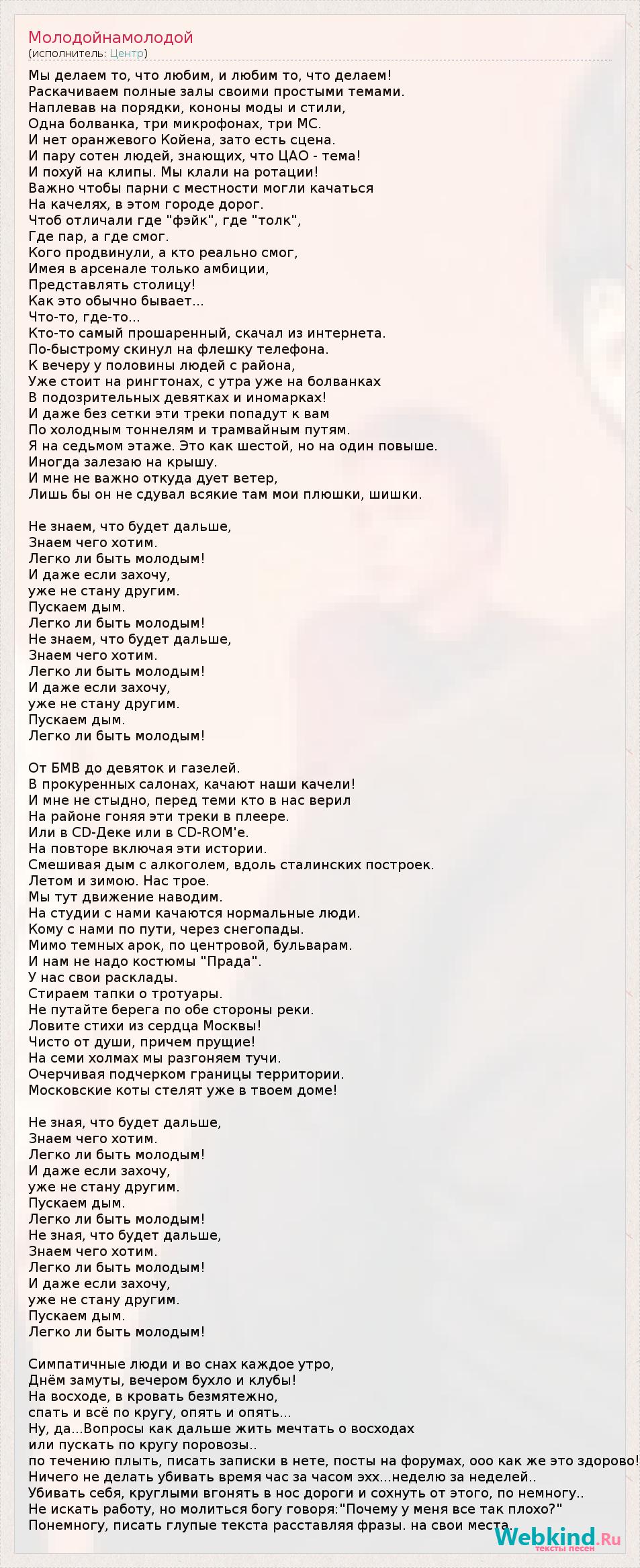 Мы делаем то, что любим, и любим то, что делаем! Раскачиваем полные залы своими простыми темами. Наплевав на порядки, кононы моды и стили, Одна болванка, три микрофонах, три МС. И нет оранжевого Койена, зато есть сцена. И пару сотен людей, знающих, что ЦАО - тема! И похуй на клипы. Мы клали на ротации! Важно чтобы парни с местности могли качаться На качелях, в этом городе дорог. Чтоб отличали где "фэйк", где "толк", Где пар, а где смог. Кого продвинули, а кто реально смог, Имея в арсенале только амбиции, Представлять столицу! Как это обычно бывает... Что-то, где-то... Кто-то самый прошаренный, скачал из интернета. По-быстрому скинул на флешку телефона. К вечеру у половины людей с района, Уже стоит на рингтонах, с утра уже на болванках В подозрительных девятках и иномарках! И даже без сетки эти треки попадут к вам По холодным тоннелям и трамвайным путям. Я на седьмом этаже. Это как шестой, но на один повыше. Иногда залезаю на крышу. И мне не важно откуда дует ветер, Лишь бы он не сдувал всякие там мои плюшки, шишки. Не знаем, что будет дальше, Знаем чего хотим. Легко ли быть молодым! И даже если захочу, уже не стану другим. Пускаем дым. Легко ли быть молодым! Не знаем, что будет дальше, Знаем чего хотим. Легко ли быть молодым! И даже если захочу, уже не стану другим. Пускаем дым. Легко ли быть молодым! От БМВ до девяток и газелей. В прокуренных салонах, качают наши качели! И мне не стыдно, перед теми кто в нас верил На районе гоняя эти треки в плеере. Или в CD-Деке или в CD-ROM'е. На повторе включая эти истории. Смешивая дым с алкоголем, вдоль сталинских построек. Летом и зимою. Нас трое. Мы тут движение наводим. На студии с нами качаются нормальные люди. Кому с нами по пути, через снегопады. Мимо темных арок, по центровой, бульварам. И нам не надо костюмы "Прада". У нас свои расклады. Стираем тапки о тротуары. Не путайте берега по обе стороны реки. Ловите стихи из сердца Москвы! Чисто от души, причем прущие! На семи холмах мы разгоняем тучи. Очерчивая подчерком границы территории. Московские коты стелят уже в твоем доме! Не зная, что будет дальше, Знаем чего хотим. Легко ли быть молодым! И даже если захочу, уже не стану другим. Пускаем дым. Легко ли быть молодым! Не зная, что будет дальше, Знаем чего хотим. Легко ли быть молодым! И даже если захочу, уже не стану другим. Пускаем дым. Легко ли быть молодым! Симпатичные люди и во снах каждое утро, Днём замуты, вечером бухло и клубы! На восходе, в кровать безмятежно, спать и всё по кругу, опять и опять... Ну, да...Вопросы как дальше жить мечтать о восходах или пускать по кругу поровозы.. по течению плыть, писать записки в нете, посты на форумах, ооо как же это здорово! Ничего не делать убивать время час за часом эхх...неделю за неделей.. Убивать себя, круглыми вгонять в нос дороги и сохнуть от этого, по немногу.. Не искать работу, но молиться богу говоря:"Почему у меня все так плохо?" Понемногу, писать глупые текста расставляя фразы. на свои места..