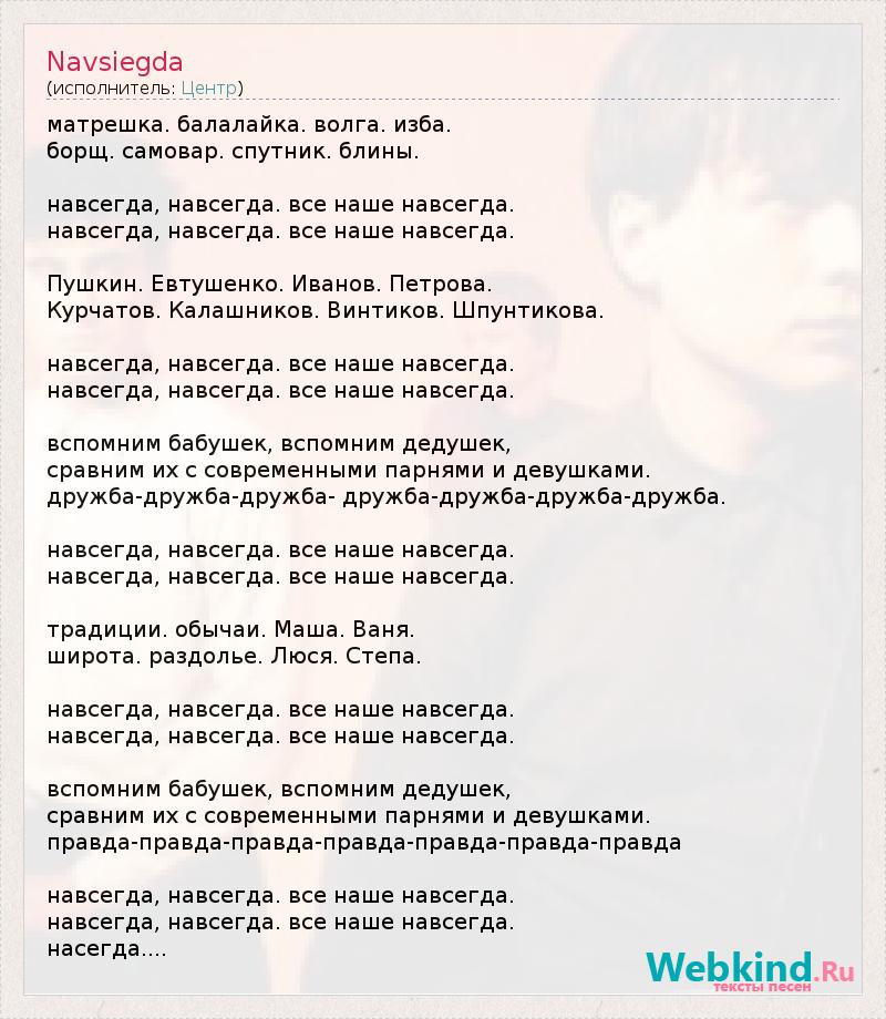 матрешка. балалайка. волга. изба. борщ. самовар. спутник. блины. навсегда, навсегда. все наше навсегда. навсегда, навсегда. все наше навсегда. Пушкин. Евтушенко. Иванов. Петрова. Курчатов. Калашников. Винтиков. Шпунтикова. навсегда, навсегда. все наше навсегда. навсегда, навсегда. все наше навсегда. вспомним бабушек, вспомним дедушек, сравним их с современными парнями и девушками. дружба-дружба-дружба- дружба-дружба-дружба-дружба. навсегда, навсегда. все наше навсегда. навсегда, навсегда. все наше навсегда. традиции. обычаи. Маша. Ваня. широта. раздолье. Люся. Степа. навсегда, навсегда. все наше навсегда. навсегда, навсегда. все наше навсегда. вспомним бабушек, вспомним дедушек, сравним их с современными парнями и девушками. правда-правда-правда-правда-правда-правда-правда навсегда, навсегда. все наше навсегда. навсегда, навсегда. все наше навсегда. насегда....