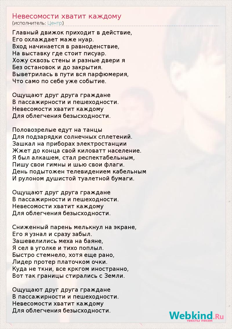 Главный движок приходит в действие, Его охлаждает маже нуар. Вход начинается в равноденствие, На выставку где стоит писуар. Хожу сквозь стены и разные двери я Без остановок и до закрытия. Выветрилась в пути вся парфюмерия, Что само по себе уже событие. Ощущают друг друга граждане В пассажирности и пешеходности. Невесомости хватит каждому Для облегчения безысходности. Половозрелые едут на танцы Для подзарядки солнечных сплетений. Зашкал на приборах электростанции Жжет до конца свой киловатт население. Я был алкашем, стал респектабельным, Пишу свои гимны и шью свои флаги. День подытожен телевидением кабельным И рулоном душистой туалетной бумаги. Ощущают друг друга граждане В пассажирности и пешеходности. Невесомости хватит каждому Для облегчения безысходности. Сниженный парень мелькнул на экране, Его я узнал и сразу забыл. Зашевелились меха на баяне, Я сел в уголке и тихо поплыл. Быстро стемнело, хотя еще рано, Лидер протер платочком очки. Куда не ткни, все кркгом иностранно, Вот так границы стирались с Земли. Ощущают друг друга граждане В пассажирности и пешеходности. Невесомости хватит каждому Для облегчения безысходности.