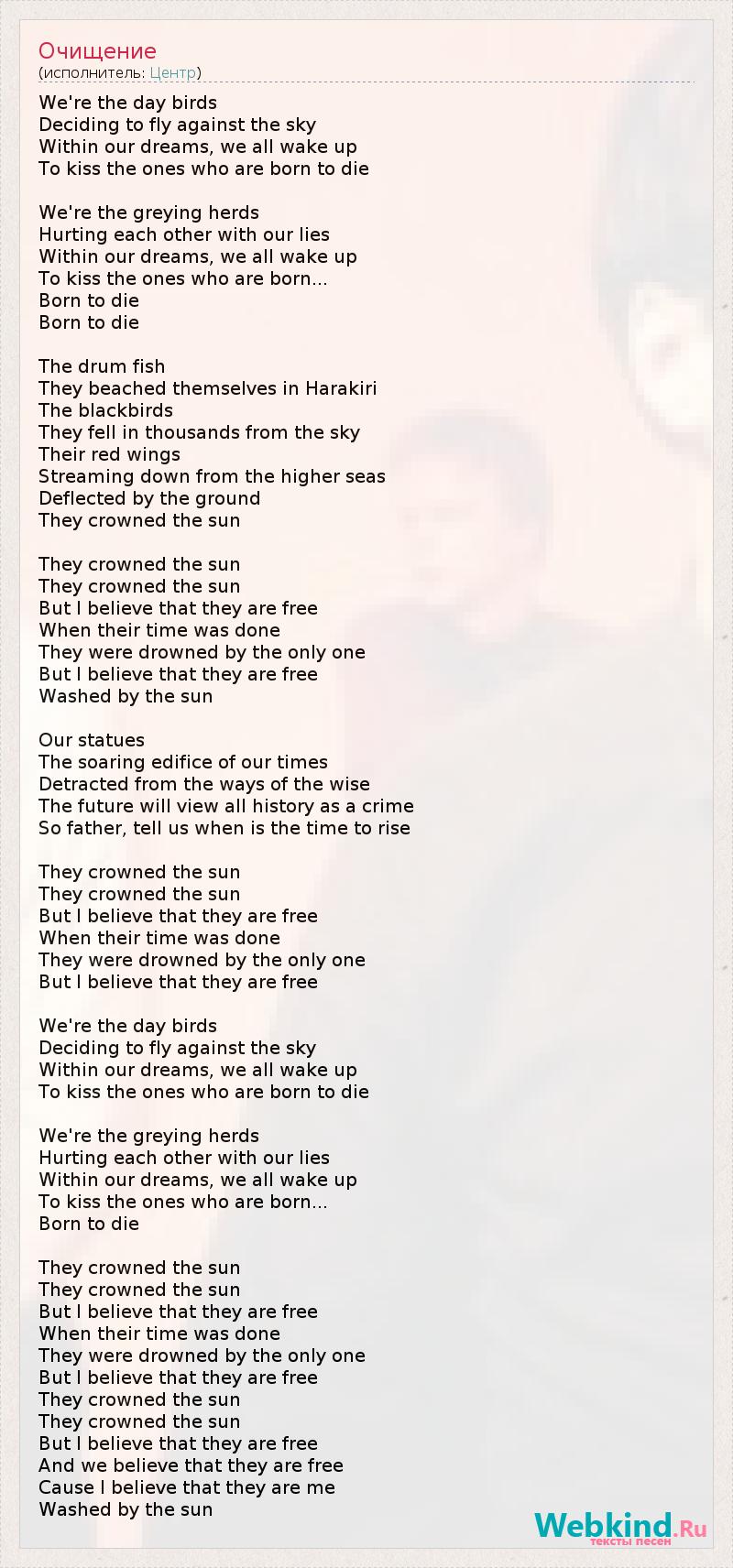 Мы дневные птицы, Решившие лететь против ветра. Мечтая, мы просыпаемся, Чтобы поцеловать тех, кто рождён, чтобы умереть. Мы седеющие стада тех, Кто ранит друг друга своей ложью. Мечтая, мы просыпаемся, Чтобы поцеловать тех, кто рождён... Рождён, чтобы умереть. Рождён, чтобы мереть. Рыбы Выбросились на берег, чтобы совершить харакири. Дрозды Тысячами упали с неба. Их красные крылья Пронеслись с небесного моря И, отразившись от земли, Они увенчали солнце. Они увенчали солнце. Они увенчали солнце. Но я верю, что они стали свободными, Когда их время пришло. Они были потоплены Всевышним, Но я верю, что они стали свободными После очищения солнцем. Наши памятники - Это возвышающаяся доктрина нашего времени, Отвлечённая от мудрых путей развития. Будущее будет считать историю преступлением. Поэтому отец, скажи, когда настанет время восстать. Они увенчали солнце. Они увенчали солнце. Но я верю, что они стали свободными, Когда их время пришло. Они были потоплены Всевышним, Но я верю, что они стали свободными. Мы дневные птицы, Решившие лететь против ветра. Мечтая, мы просыпаемся, Чтобы поцеловать тех, кто рождён, чтобы умереть. Мы седеющие стада тех, Кто ранит друг друга своей ложью. Мечтая, мы просыпаемся, Чтобы поцеловать тех, кто рождён... Рождён, чтобы умереть. Они увенчали солнце. Они увенчали солнце. Но я верю, что они стали свободными, Когда их время пришло. Они были потоплены Всевышним, Но я верю, что они стали свободными, Они увенчали солнце. Они увенчали солнце. Но я верю, что они стали свободными, И мы верим, что они стали свободными, Потому что я верю, что они - это я, Очищенный солнцем.