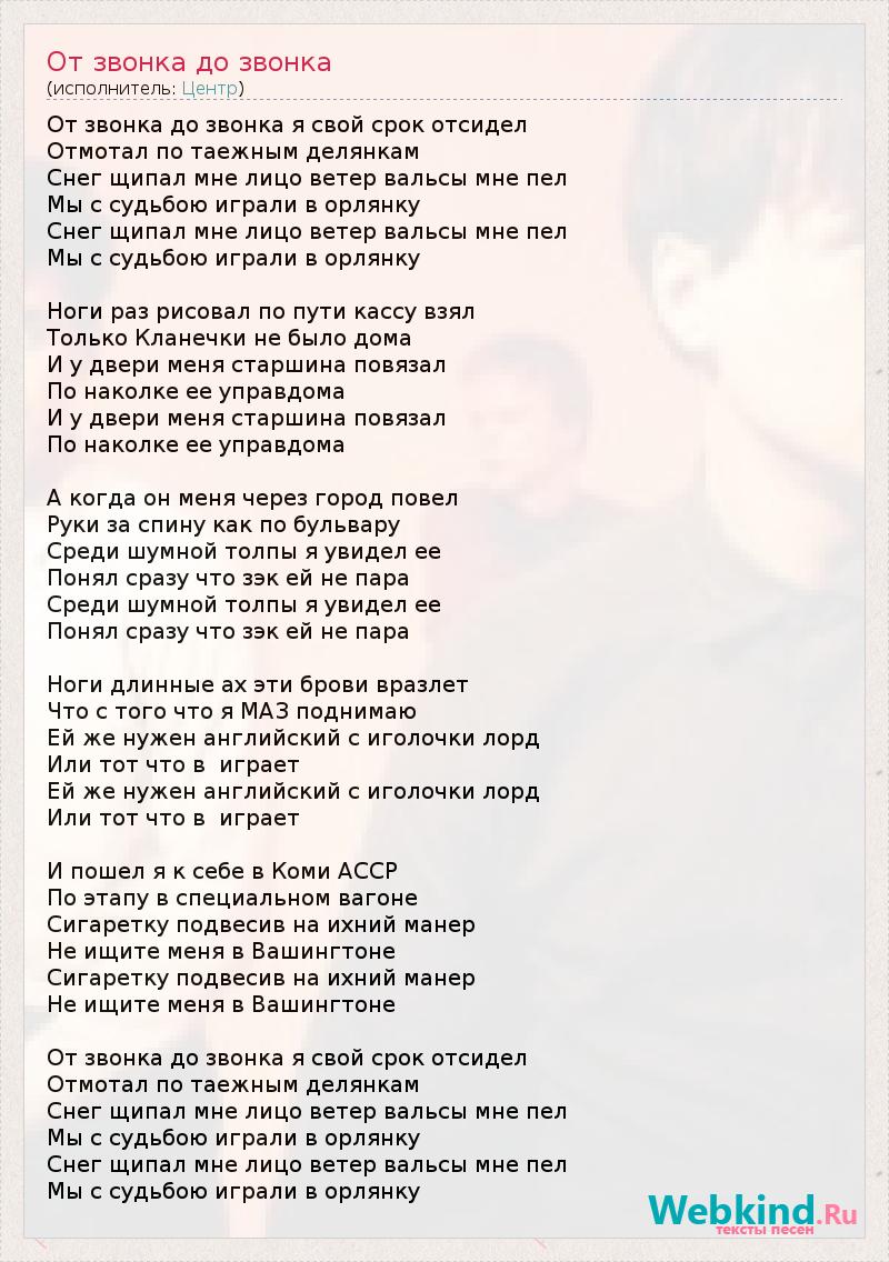 От звонка до звонка я свой срок отсидел Отмотал по таежным делянкам Снег щипал мне лицо ветер вальсы мне пел Мы с судьбою играли в орлянку Снег щипал мне лицо ветер вальсы мне пел Мы с судьбою играли в орлянку Ноги раз рисовал по пути кассу взял Только Кланечки не было дома И у двери меня старшина повязал По наколке ее управдома И у двери меня старшина повязал По наколке ее управдома А когда он меня через город повел Руки за спину как по бульвару Среди шумной толпы я увидел ее Понял сразу что зэк ей не пара Среди шумной толпы я увидел ее Понял сразу что зэк ей не пара Ноги длинные ах эти брови вразлет Что с того что я МАЗ поднимаю Ей же нужен английский с иголочки лорд Или тот что в играет Ей же нужен английский с иголочки лорд Или тот что в играет И пошел я к себе в Коми АССР По этапу в специальном вагоне Сигаретку подвесив на ихний манер Не ищите меня в Вашингтоне Сигаретку подвесив на ихний манер Не ищите меня в Вашингтоне От звонка до звонка я свой срок отсидел Отмотал по таежным делянкам Снег щипал мне лицо ветер вальсы мне пел Мы с судьбою играли в орлянку Снег щипал мне лицо ветер вальсы мне пел Мы с судьбою играли в орлянку