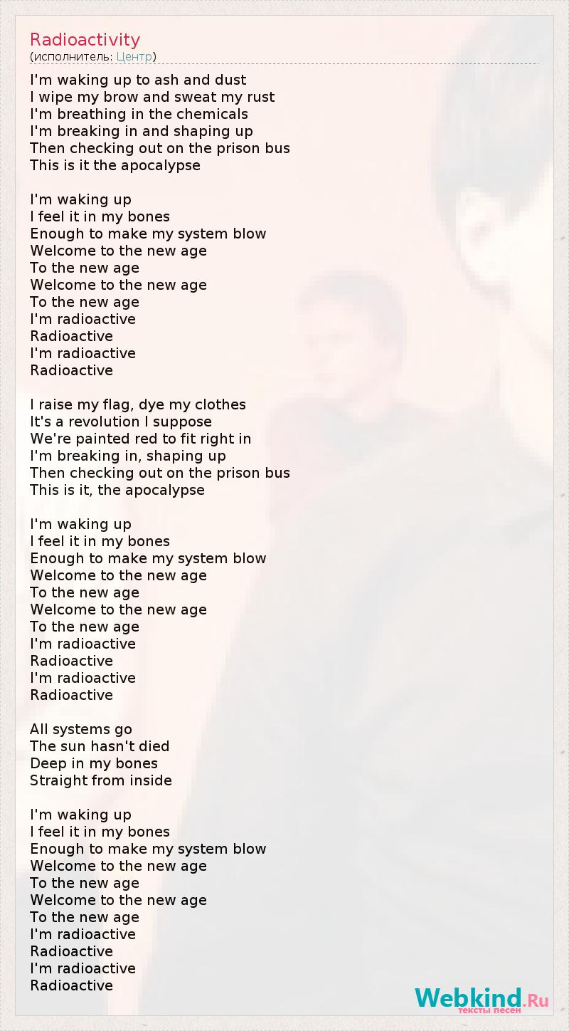 Я пробуждаюсь среди пепла и пыли, Вытираю ржавчину, что проступает пóтом. Каждый вдох полон химикатов, Я разрушаюсь и формируюсь снова, Затем расплачиваюсь и выхожу из тюремного автобуса. Вот и всё, это апокалипсис. Это пробуждение, Ощущаю его каждой частичкой тела. Этого чувства достаточно, чтобы снесло крышу. Добро пожаловать в новую эру, В новую эру! Добро пожаловать в новую эру, В новую эру! Я - радиоактивен, Радиоактивен. Я - радиоактивен, Радиоактивен. Я поднимаю свое знамя, переодеваюсь в одежду другого цвета. 1 Полагаю, что это - революция. Чтобы соответствовать ей, мы окрасились в красное. Я разрушаюсь и формируюсь снова, Затем расплачиваюсь и выхожу из тюремного автобуса. Вот и все, это апокалипсис. Это пробуждение, Ощущаю его каждой частичкой тела. Этого чувства достаточно, чтобы снесло крышу. Добро пожаловать в новую эру, В новую эру! Добро пожаловать в новую эру, В новую эру! Я - радиоактивен, Радиоактивен. Я - радиоактивен, Радиоактивен. Все системы в норме, Солнце не погасло. Оно глубоко внутри, Прямо во мне... Это пробуждение, Ощущаю его каждой частичкой тела. Этого чувства достаточно, чтобы снесло крышу. Добро пожаловать в новую эру, В новую эру! Добро пожаловать в новую эру, В новую эру! Я - радиоактивен, Радиоактивен. Я - радиоактивен, Радиоактивен. 1 - буквально: перекрашиваю свою одежду