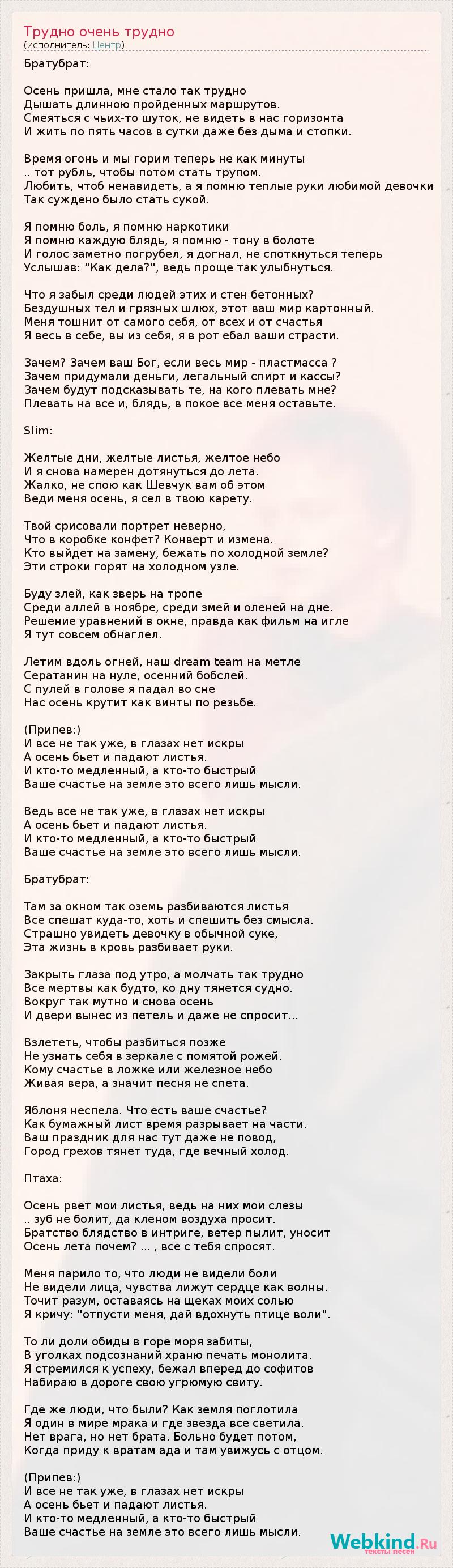 Братубрат: Осень пришла, мне стало так трудно Дышать длинною пройденных маршрутов. Смеяться с чьих-то шуток, не видеть в нас горизонта И жить по пять часов в сутки даже без дыма и стопки. Время огонь и мы горим теперь не как минуты .. тот рубль, чтобы потом стать трупом. Любить, чтоб ненавидеть, а я помню теплые руки любимой девочки Так суждено было стать сукой. Я помню боль, я помню наркотики Я помню каждую блядь, я помню - тону в болоте И голос заметно погрубел, я догнал, не споткнуться теперь Услышав: "Как дела?", ведь проще так улыбнуться. Что я забыл среди людей этих и стен бетонных? Бездушных тел и грязных шлюх, этот ваш мир картонный. Меня тошнит от самого себя, от всех и от счастья Я весь в себе, вы из себя, я в рот ебал ваши страсти. Зачем? Зачем ваш Бог, если весь мир - пластмасса ? Зачем придумали деньги, легальный спирт и кассы? Зачем будут подсказывать те, на кого плевать мне? Плевать на все и, блядь, в покое все меня оставьте. Slim: Желтые дни, желтые листья, желтое небо И я снова намерен дотянуться до лета. Жалко, не спою как Шевчук вам об этом Веди меня осень, я сел в твою карету. Твой срисовали портрет неверно, Что в коробке конфет? Конверт и измена. Кто выйдет на замену, бежать по холодной земле? Эти строки горят на холодном узле. Буду злей, как зверь на тропе Среди аллей в ноябре, среди змей и оленей на дне. Решение уравнений в окне, правда как фильм на игле Я тут совсем обнаглел. Летим вдоль огней, наш dream team на метле Сератанин на нуле, осенний бобслей. С пулей в голове я падал во сне Нас осень крутит как винты по резьбе. (Припев:) И все не так уже, в глазах нет искры А осень бьет и падают листья. И кто-то медленный, а кто-то быстрый Ваше счастье на земле это всего лишь мысли. Ведь все не так уже, в глазах нет искры А осень бьет и падают листья. И кто-то медленный, а кто-то быстрый Ваше счастье на земле это всего лишь мысли. Братубрат: Там за окном так оземь разбиваются листья Все спешат куда-то, хоть и спешить без смысла. Страшно увидеть девочку в обычной суке, Эта жизнь в кровь разбивает руки. Закрыть глаза под утро, а молчать так трудно Все мертвы как будто, ко дну тянется судно. Вокруг так мутно и снова осень И двери вынес из петель и даже не спросит... Взлететь, чтобы разбиться позже Не узнать себя в зеркале с помятой рожей. Кому счастье в ложке или железное небо Живая вера, а значит песня не спета. Яблоня неспела. Что есть ваше счастье? Как бумажный лист время разрывает на части. Ваш праздник для нас тут даже не повод, Город грехов тянет туда, где вечный холод. Птаха: Осень рвет мои листья, ведь на них мои слезы .. зуб не болит, да кленом воздуха просит. Братство блядство в интриге, ветер пылит, уносит Осень лета почем? ... , все с тебя спросят. Меня парило то, что люди не видели боли Не видели лица, чувства лижут сердце как волны. Точит разум, оставаясь на щеках моих солью Я кричу: "отпусти меня, дай вдохнуть птице воли". То ли доли обиды в горе моря забиты, В уголках подсознаний храню печать монолита. Я стремился к успеху, бежал вперед до софитов Набираю в дороге свою угрюмую свиту. Где же люди, что были? Как земля поглотила Я один в мире мрака и где звезда все светила. Нет врага, но нет брата. Больно будет потом, Когда приду к вратам ада и там увижусь с отцом. (Припев:) И все не так уже, в глазах нет искры А осень бьет и падают листья. И кто-то медленный, а кто-то быстрый Ваше счастье на 