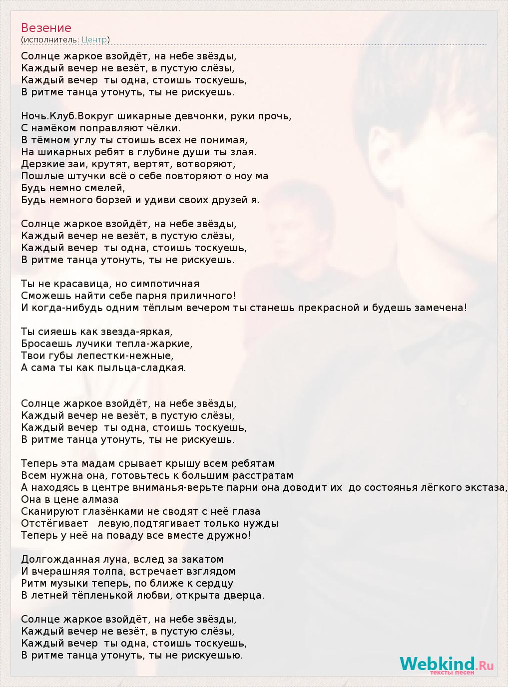 Солнце жаркое взойдёт, на небе звёзды, Каждый вечер не везёт, в пустую слёзы, Каждый вечер ты одна, стоишь тоскуешь, В ритме танца утонуть, ты не рискуешь. Ночь.Клуб.Вокруг шикарные девчонки, руки прочь, С намёком поправляют чёлки. В тёмном углу ты стоишь всех не понимая, На шикарных ребят в глубине души ты злая. Дерзкие заи, крутят, вертят, вотворяют, Пошлые штучки всё о себе повторяют о ноу ма Будь немно смелей, Будь немного борзей и удиви своих друзей я. Солнце жаркое взойдёт, на небе звёзды, Каждый вечер не везёт, в пустую слёзы, Каждый вечер ты одна, стоишь тоскуешь, В ритме танца утонуть, ты не рискуешь. Ты не красавица, но симпотичная Сможешь найти себе парня приличного! И когда-нибудь одним тёплым вечером ты станешь прекрасной и будешь замечена! Ты сияешь как звезда-яркая, Бросаешь лучики тепла-жаркие, Твои губы лепестки-нежные, А сама ты как пыльца-сладкая. Солнце жаркое взойдёт, на небе звёзды, Каждый вечер не везёт, в пустую слёзы, Каждый вечер ты одна, стоишь тоскуешь, В ритме танца утонуть, ты не рискуешь. Теперь эта мадам срывает крышу всем ребятам Всем нужна она, готовьтесь к большим расстратам А находясь в центре вниманья-верьте парни она доводит их до состоянья лёгкого экстаза, Она в цене алмаза Сканируют глазёнками не сводят с неё глаза Отстёгивает левую,подтягивает только нужды Теперь у неё на поваду все вместе дружно! Долгожданная луна, вслед за закатом И вчерашняя толпа, встречает взглядом Ритм музыки теперь, по ближе к сердцу В летней тёпленькой любви, открыта дверца. Солнце жаркое взойдёт, на небе звёзды, Каждый вечер не везёт, в пустую слёзы, Каждый вечер ты одна, стоишь тоскуешь, В ритме танца утонуть, ты не рискуешью.