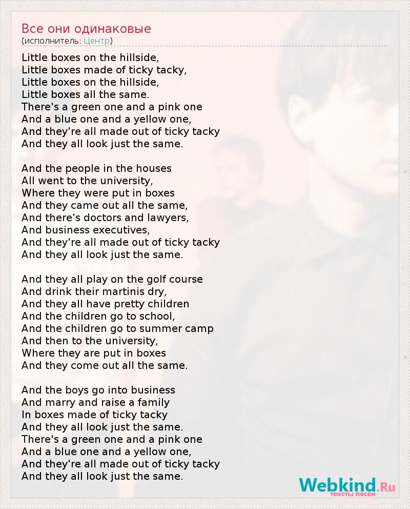 Маленькие дома-коробочки на склоне холма, Маленькие дома-коробочки, построенные из дешевого, непрочного материала. Маленькие дома-коробочки на склоне холма, Маленькие дома-коробочки все одинаковые. Есть зеленый домик и розовый, Синий и желтый, И все они построены из дешевого, непрочного материала, И все они выглядят совсем одинаково. И люди, живущие в домиках, Все ходили в университет, Где их помещали в классы-коробки, И они вышли оттуда все одинаковые, И среди них доктора и юристы, И руководящие работники, И все они сделаны из дешевого материала, И все они выглядят совсем одинаково. И все они играют на поле для гольфа И пьют свой сухой "Мартини". И у всех них замечательные дети. И дети ходят в школу, И дети ездят в летний лагерь, А затем ходят в университет, Где их помещают в классы-коробки, И они выходят оттуда все одинаковые. И мальчики идут в бизнес И женятся, и растят детей В домах-коробочках из дешевого, непрочного материала, И все они выглядят совсем одинаково. Есть зеленый домик и розовый, Синий и желтый, И все они построены из дешевого, непрочного материала, И все они выглядят совсем одинаково. 1 - кавер-версия песни, написанной Мальвиной Рейнольдс в 1962 году и исполненная Питом Сигером в 1963 году. Эта песня - политическая сатира развивающегося пригорода и конформистских взглядов среднего класса. Она о застройке однотипными домами - разноцветными "маленькими коробками" из дешевого, непрочного материала, которые выглядят одинаково.