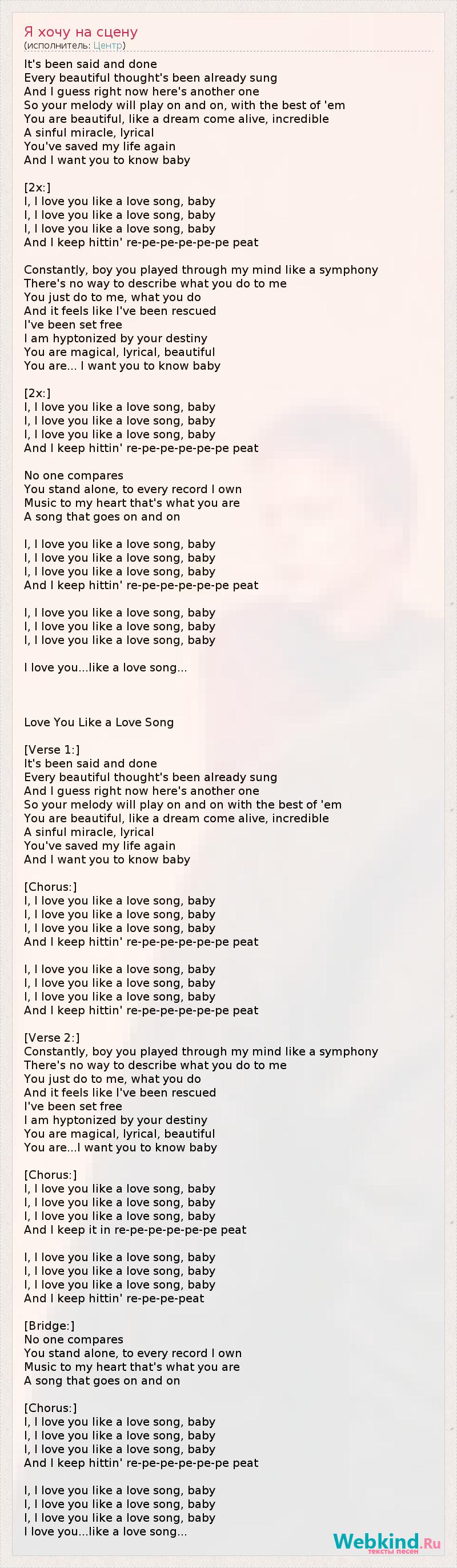 It's been said and done Every beautiful thought's been already sung And I guess right now here's another one So your melody will play on and on, with the best of 'em You are beautiful, like a dream come alive, incredible A sinful miracle, lyrical You've saved my life again And I want you to know baby [2x:] I, I love you like a love song, baby I, I love you like a love song, baby I, I love you like a love song, baby And I keep hittin' re-pe-pe-pe-pe-pe peat Constantly, boy you played through my mind like a symphony There's no way to describe what you do to me You just do to me, what you do And it feels like I've been rescued I've been set free I am hyptonized by your destiny You are magical, lyrical, beautiful You are... I want you to know baby [2x:] I, I love you like a love song, baby I, I love you like a love song, baby I, I love you like a love song, baby And I keep hittin' re-pe-pe-pe-pe-pe peat No one compares You stand alone, to every record I own Music to my heart that's what you are A song that goes on and on I, I love you like a love song, baby I, I love you like a love song, baby I, I love you like a love song, baby And I keep hittin' re-pe-pe-pe-pe-pe peat I, I love you like a love song, baby I, I love you like a love song, baby I, I love you like a love song, baby I love you...like a love song... Love You Like a Love Song [Verse 1:] It's been said and done Every beautiful thought's been already sung And I guess right now here's another one So your melody will play on and on with the best of 'em You are beautiful, like a dream come alive, incredible A sinful miracle, lyrical You've saved my life again And I want you to know baby [Chorus:] I, I love you like a love song, baby I, I love you like a love song, baby I, I love you like a love song, baby And I keep hittin' re-pe-pe-pe-pe-pe peat I, I love you like a love song, baby I, I love you like a love song, baby I, I love you like a love song, baby And I keep hittin' re-pe-pe-pe-pe-pe peat [Verse 2:] Constantly, boy you played through my mind like a symphony There's no way to describe what you do to me You just do to me, what you do And it feels like I've been rescued I've been set free I am hyptonized by your destiny You are magical, lyrical, beautiful You are...I want you to know baby [Chorus:] I, I love you like a love song, baby I, I love you like a love song, baby I, I love you like a love song, baby And I keep it in re-pe-pe-pe-pe-pe peat I, I love you like a love song, baby I, I love you like a love song, baby I, I love you like a love song, baby And I keep hittin' re-pe-pe-peat [Bridge:] No one compares You stand alone, to every record I own Music to my heart that's what you are A song that goes on and on [Chorus:] I, I love you like a love song, baby I, I love you like a love song, baby I, I love you like a love song, baby And I keep hittin' re-pe-pe-pe-pe-pe peat I, I love you like a love song, baby I, I love you like a love song, baby I, I love you like a love song, baby I love you...like a love song...
