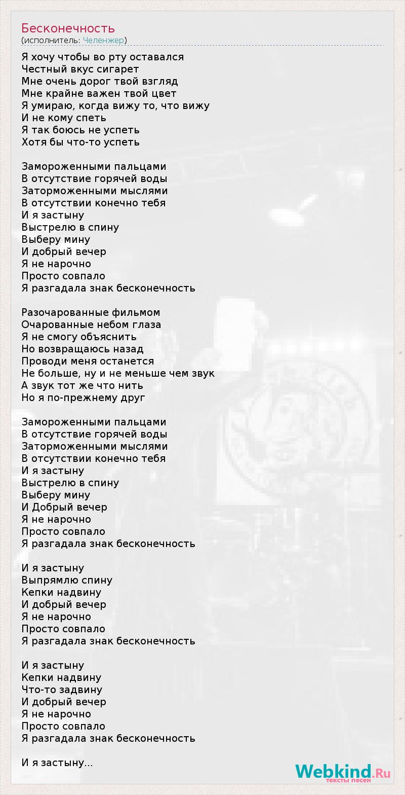 Я хочу чтобы во рту оставался Честный вкус сигарет Мне очень дорог твой взгляд Мне крайне важен твой цвет Я умираю, когда вижу то, что вижу И не кому спеть Я так боюсь не успеть Хотя бы что-то успеть Замороженными пальцами В отсутствие горячей воды Заторможенными мыслями В отсутствии конечно тебя И я застыну Выстрелю в спину Выберу мину И добрый вечер Я не нарочно Просто совпало Я разгадала знак бесконечность Разочарованные фильмом Очарованные небом глаза Я не смогу объяснить Но возвращаюсь назад Проводи меня останется Не больше, ну и не меньше чем звук А звук тот же что нить Но я по-прежнему друг Замороженными пальцами В отсутствие горячей воды Заторможенными мыслями В отсутствии конечно тебя И я застыну Выстрелю в спину Выберу мину И Добрый вечер Я не нарочно Просто совпало Я разгадала знак бесконечность И я застыну Выпрямлю спину Кепки надвину И добрый вечер Я не нарочно Просто совпало Я разгадала знак бесконечность И я застыну Кепки надвину Что-то задвину И добрый вечер Я не нарочно Просто совпало Я разгадала знак бесконечность И я застыну... Земфира - Бесконечность