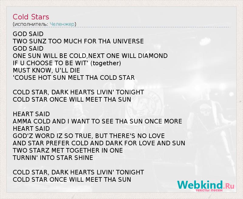 Бог сказал ДВА Sunz слишком много для THA ВСЕЛЕННОЙ Бог сказал ONE ВС будет холодно , следующий будет DIAMOND ЕСЛИ U выбрать, чтобы быть ВИТ " ( вместе) ДОЛЖЕН ЗНАТЬ , U'LL DIE " Couse жаркое солнце MELT THA холодная звезда Холодная звезда , сегодня DARK сердца Livin ' Холодная звезда РАЗ БУДЕТ ОТВЕЧАТЬ THA ВС СЕРДЦЕ СКАЗАЛ AMMA холодно и я хочу видеть THA ВС еще раз СЕРДЦЕ СКАЗАЛ GOD'Z WORD ИЗ так верно, но нет никакой любви И звезда PREFER холодно и темно любви и ВС ДВА STARZ MET вместе в одном TURNIN " в звездные SHINE Холодная звезда , сегодня DARK сердца Livin ' Холодная звезда РАЗ БУДЕТ ОТВЕЧАТЬ THA ВС