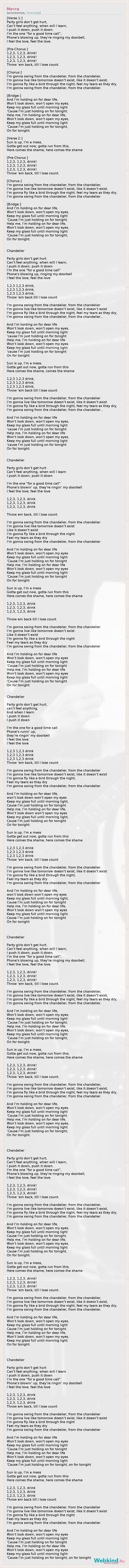 [Verse 1:] Party girls don't get hurt, Can't feel anything, when will I learn, I push it down, push it down. I'm the one “for a good time call”, Phone's blowing up, they're ringing my doorbell, I feel the love, feel the love. [Pre-Chorus:] 1,2,3, 1,2,3, drink! 1,2,3, 1,2,3, drink! 1,2,3, 1,2,3, drink! Throw ‘em back, till I lose count. [Chorus:] I'm gonna swing from the chandelier, from the chandelier, I'm gonna live like tomorrow doesn't exist, like it doesn't exist, I'm gonna fly like a bird through the night, feel my tears as they dry, I'm gonna swing from the chandelier, from the chandelier. [Bridge:] And I'm holding on for dear life, Won't look down, won't open my eyes, Keep my glass full until morning light ‘Cause I'm just holding on for tonight. Help me, I'm holding on for dear life, Won't look down, won't open my eyes, Keep my glass full until morning light ‘Cause I'm just holding on for tonight, On for tonight. [Verse 2:] Sun is up, I'm a mess, Gotta get out now, gotta run from this, Here comes the shame, here comes the shame [Pre-Chorus:] 1,2,3, 1,2,3, drink! 1,2,3, 1,2,3, drink! 1,2,3, 1,2,3, drink! Throw ‘em back, till I lose count. [Chorus:] I'm gonna swing from the chandelier, from the chandelier, I'm gonna live like tomorrow doesn't exist, like it doesn't exist, I'm gonna fly like a bird through the night, feel my tears as they dry, I'm gonna swing from the chandelier, from the chandelier. [Bridge:] And I'm holding on for dear life, Won't look down, won't open my eyes, Keep my glass full until morning light ‘Cause I'm just holding on for tonight. Help me, I'm holding on for dear life, Won't look down, won't open my eyes, Keep my glass full until morning light ‘Cause I'm just holding on for tonight, On for tonight. Chandelier Party girls don't get hurt Can't feel anything, when will I learn, I push it down, push it down I'm the one "for a good time call" Phone's blowing up, ringing my doorbell I feel the love, feel the love 1,2,3 1,2,3 drink, 1,2,3 1,2,3 drink, 1,2,3 1,2,3 drink, Throw 'em back till I lose count I'm gonna swing from the chandelier, from the chandelier I'm gonna live like tomorrow doesn't exist, like it doesn't exist I'm gonna fly like a bird through the night, feel my tears as they dry, I'm gonna swing from the chandelier, from the chandelier... And I'm holding on for dear life Won't look down, won't open my eyes, Keep my glass full until morning light 'cause I'm just holding on for tonight Help me, I'm holding on for dear life Won't look down, won't open my eyes, Keep my glass full until morning light 'cause I'm just holding on for tonight On for tonight Sun is up, I'm a mess, Gotta get out now, gotta run from this Here comes the shame, comes the shame 1,2,3 1,2,3 drink, 1,2,3 1,2,3 drink, 1,2,3 1,2,3 drink, Throw 'em back till I lose count I'm gonna swing from the chandelier, from the chandelier I'm gonna live like tomorrow doesn't exist, like it doesn't exist I'm gonna fly like a bird through the night, feel my tears as they dry, I'm gonna swing from the chandelier, from the chandelier... And I'm holding on for dear life Won't look down, won't open my eyes, Keep my glass full until morning light 'cause I'm just holding on for tonight Help me, I'm holding on for dear life Won't look down, won't open my eyes, Keep my glass full until morning light 'cause I'm just holding on for tonight On for tonight Chandelier Party girls don't get hurt Can't feel anything, when will I learn I push it down, push it down I'm the one "for a good time call" Phone's blowin' up, they're ringin' my doorbell I feel the love, feel the love 1,2,3, 1,2,3, drink 1,2,3, 1,2,3, drink 1,2,3, 1,2,3, drink Throw em back, till I lose count I'm gonna swing from the chandelier, from the chandelier I'm gonna live like tomorrow doesn't exist Like it doesn't exist I'm gonna fly like a bird through the night Feel my tears as they dry I'm gonna swing from the chandelier, from the chandelier And I'm holding on for dear life Won't look down, won't open my eyes Keep my glass full until morning light 'Cause I'm just holding on for tonight Help me, I'm holding on for dear life Won't look down, won't open my eyes Keep my glass full until morning light 'Cause I'm just holding on for tonight On for tonight Sun is up, I'm a mess Gotta get out now, gotta run from this Here comes the shame, here comes the shame 1,2,3, 1,2,3, drink 1,2,3, 1,2,3, drink 1,2,3, 1,2,3, drink Throw em back till I lose count I'm gonna swing from the chandelier, from the chandelier I'm gonna live like tomorrow doesn't exist Like it doesn't exist I'm gonna fly like a bird through the night Feel my tears as they dry I'm gonna swing from the chandelier, from the chandelier And I'm holding on for dear life Won't look down, won't open my eyes Keep my glass full until morning light 'Cause I'm just holding on for tonight Help me, I'm holding on for dear life Won't look down, won't open my eyes Keep my glass full until morning light 'Cause I'm just holding on for tonight On for tonight Chandelier Party girls don't get hurt, can't feel anything, And when I learn I push it down I push it down I'm the one for a good time call Phone's runin' up, they're ringin' my doorbell I feel the love I feel the love 1,2,3 1,2,3 drink 1,2,3 1,2,3 drink 1,2,3 1,2,3 drink Throw 'em back, till I lose count I'm gonna swing from the chandelier, from the chandelier I'm gonna live like tomorrow doesn't exist, like it doesn't exist I'm gonna fly like a bird through the night, Feel my tears as they dry I'm gonna swing from the chandelier, from the chandelier And I'm holding on for dear life, won't look down won't open my eyes Keep my glass full until morning light, Cause I'm just holding on for tonight Help me, I'm holding on for dear life, Won't look down won't open my eyes Keep my glass full until morning light, Cause I'm just holding on for tonight On for tonight Sun is up, I'm a mess Gotta get out now, gotta run from this Here comes the shame, 