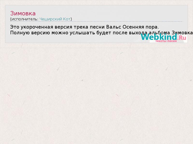 Это укороченная версия трека песни Вальс Осенняя пора. Полную версию можно услышать будет после выхода альбома Зимовка