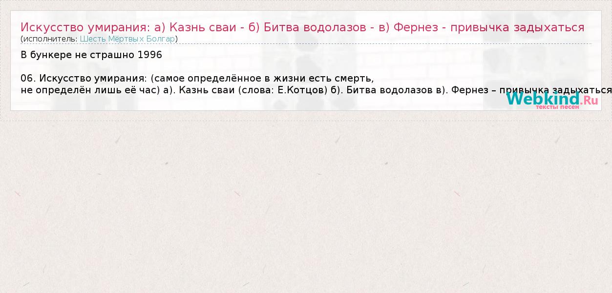 Главная→Исполнители→Шесть Мёртвых Болгар→Искусство умирания: а) Казнь сваи - б) Битва водолазов - в) Фернез - привычка задыхаться