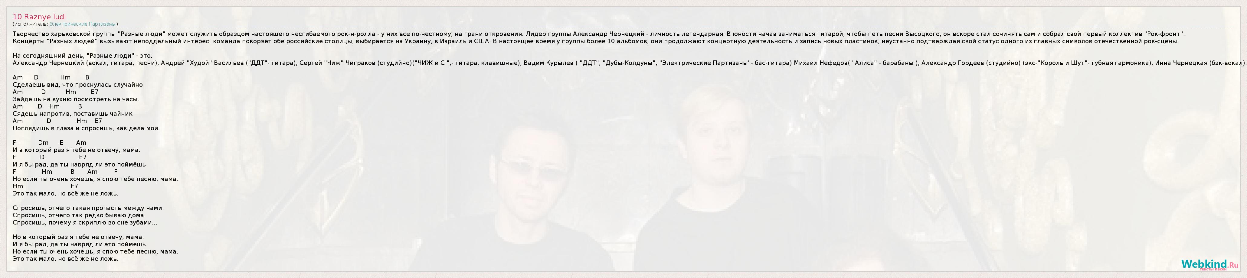 Творчество харьковской группы "Разные люди" может служить образцом настоящего несгибаемого рок-н-ролла - у них все по-честному, на грани откровения. Лидер группы Александр Чернецкий - личность легендарная. В юности начав заниматься гитарой, чтобы петь песни Высоцкого, он вскоре стал сочинять сам и собрал свой первый коллектив "Рок-фронт".