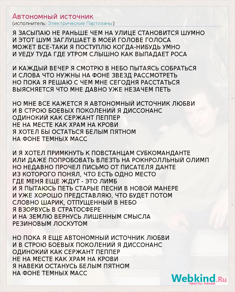 Я ЗАСЫПАЮ НЕ РАНЬШЕ ЧЕМ НА УЛИЦЕ СТАНОВИТСЯ ШУМНО И ЭТОТ ШУМ ЗАГЛУШАЕТ В МОЕЙ ГОЛОВЕ ГОЛОСА МОЖЕТ ВСЕ-ТАКИ Я ПОСТУПЛЮ КОГДА-НИБУДЬ УМНО И УЕДУ ТУДА ГДЕ УТРОМ СЛЫШНО КАК ВЫПАДАЕТ РОСА И КАЖДЫЙ ВЕЧЕР Я СМОТРЮ В НЕБО ПЫТАЯСЬ СОБРАТЬСЯ И СЛОВА ЧТО НУЖНЫ НА ФОНЕ ЗВЕЗД РАССМОТРЕТЬ НО ПОКА Я РЕШАЮ С ЧЕМ МНЕ СЕГОДНЯ РАССТАТЬСЯ ВЫЯСНЯЕТСЯ ЧТО МНЕ ДАВНО УЖЕ НЕЗАЧЕМ ПЕТЬ НО МНЕ ВСЕ КАЖЕТСЯ Я АВТОНОМНЫЙ ИСТОЧНИК ЛЮБВИ И В СТРОЮ БОЕВЫХ ПОКОЛЕНИЙ Я ДИССОНАНС ОДИНОКИЙ КАК СЕРЖАНТ ПЕППЕР НЕ НА МЕСТЕ КАК ХРАМ НА КРОВИ Я ХОТЕЛ БЫ ОСТАТЬСЯ БЕЛЫМ ПЯТНОМ НА ФОНЕ ТЕМНЫХ МАСС И Я ХОТЕЛ ПРИМКНУТЬ К ПОВСТАНЦАМ СУБКОМАНДАНТЕ ИЛИ ДАЖЕ ПОПРОБОВАТЬ ВЛЕЗТЬ НА РОКНРОЛЛЬНЫЙ ОЛИМП НО НЕДАВНО ПРОЧЕЛ ПИСЬМО ОТ ПИСАТЕЛЯ ДАНТЕ ИЗ КОТОРОГО ПОНЯЛ, ЧТО ЕСТЬ ОДНО МЕСТО ГДЕ МЕНЯ ЕЩЕ ЖДУТ - ЭТО ЛИМБ И Я ПЫТАЮСЬ ПЕТЬ СТАРЫЕ ПЕСНИ В НОВОЙ МАНЕРЕ И УЖЕ ХОРОШО ПРЕДСТАВЛЯЮ, ЧТО БУДЕТ ПОТОМ СЛОВНО ШАРИК, ОТПУЩЕННЫЙ В НЕБО Я ВЗОРВУСЬ В СТРАТОСФЕРЕ И НА ЗЕМЛЮ ВЕРНУСЬ ЛИШЕННЫМ СМЫСЛА РЕЗИНОВЫМ ЛОСКУТОМ НО ПОКА Я ЕЩЕ АВТОНОМНЫЙ ИСТОЧНИК ЛЮБВИ И В СТРОЮ БОЕВЫХ ПОКОЛЕНИЙ Я ДИССОНАНС ОДИНОКИЙ КАК СЕРЖАНТ ПЕППЕР НЕ НА МЕСТЕ КАК ХРАМ НА КРОВИ Я НАВЕКИ ОСТАНУСЬ БЕЛЫМ ПЯТНОМ НА ФОНЕ ТЕМНЫХ МАСС
