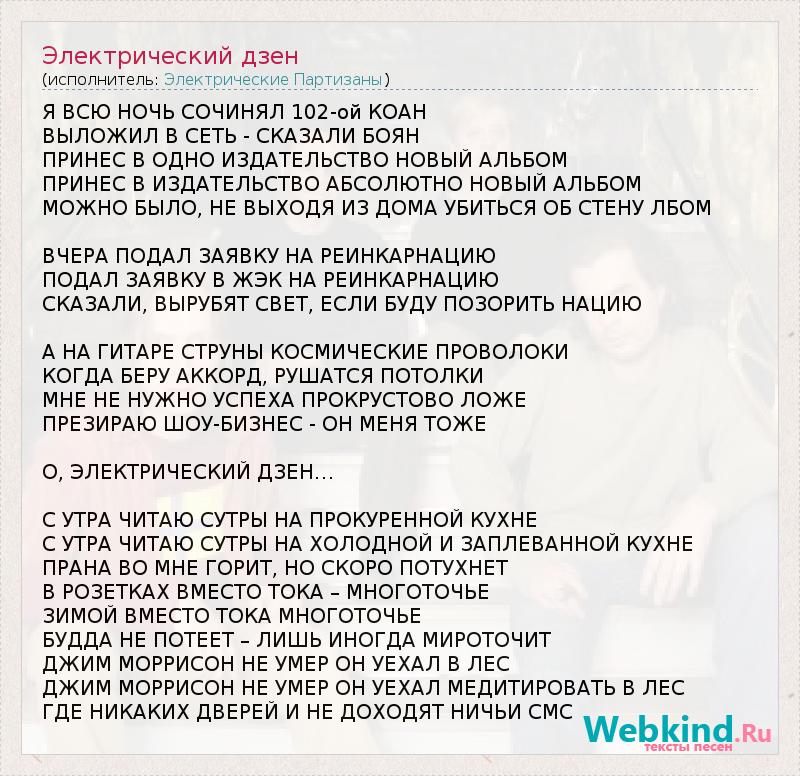 Я ВСЮ НОЧЬ СОЧИНЯЛ 102-ой КОАН ВЫЛОЖИЛ В СЕТЬ - СКАЗАЛИ БОЯН ПРИНЕС В ОДНО ИЗДАТЕЛЬСТВО НОВЫЙ АЛЬБОМ ПРИНЕС В ИЗДАТЕЛЬСТВО АБСОЛЮТНО НОВЫЙ АЛЬБОМ МОЖНО БЫЛО, НЕ ВЫХОДЯ ИЗ ДОМА УБИТЬСЯ ОБ СТЕНУ ЛБОМ ВЧЕРА ПОДАЛ ЗАЯВКУ НА РЕИНКАРНАЦИЮ ПОДАЛ ЗАЯВКУ В ЖЭК НА РЕИНКАРНАЦИЮ СКАЗАЛИ, ВЫРУБЯТ СВЕТ, ЕСЛИ БУДУ ПОЗОРИТЬ НАЦИЮ А НА ГИТАРЕ СТРУНЫ КОСМИЧЕСКИЕ ПРОВОЛОКИ КОГДА БЕРУ АККОРД, РУШАТСЯ ПОТОЛКИ МНЕ НЕ НУЖНО УСПЕХА ПРОКРУСТОВО ЛОЖЕ ПРЕЗИРАЮ ШОУ-БИЗНЕС - ОН МЕНЯ ТОЖЕ О, ЭЛЕКТРИЧЕСКИЙ ДЗЕН… С УТРА ЧИТАЮ СУТРЫ НА ПРОКУРЕННОЙ КУХНЕ С УТРА ЧИТАЮ СУТРЫ НА ХОЛОДНОЙ И ЗАПЛЕВАННОЙ КУХНЕ ПРАНА ВО МНЕ ГОРИТ, НО СКОРО ПОТУХНЕТ В РОЗЕТКАХ ВМЕСТО ТОКА – МНОГОТОЧЬЕ ЗИМОЙ ВМЕСТО ТОКА МНОГОТОЧЬЕ БУДДА НЕ ПОТЕЕТ – ЛИШЬ ИНОГДА МИРОТОЧИТ ДЖИМ МОРРИСОН НЕ УМЕР ОН УЕХАЛ В ЛЕС ДЖИМ МОРРИСОН НЕ УМЕР ОН УЕХАЛ МЕДИТИРОВАТЬ В ЛЕС ГДЕ НИКАКИХ ДВЕРЕЙ И НЕ ДОХОДЯТ НИЧЬИ СМС