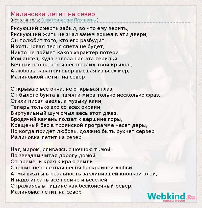 Рисующий смерть забыл, во что ему верить, Рискующий жить не знал зачем вошел в эти двери, Он полюбит того, кто его разбудит, И хоть новая песня спета не будет, Никто не поймет каков характер потери. Мой ангел, куда завела нас эта герилья Вечный огонь, что я нес опалил твои крылья, А любовь, как приговор высшая из всех мер, Малиновкой летит на север Открываю все окна, не открывая глаз, От былого бунта в памяти мира только несколько фраз. Стихи писал авель, а музыку каин, Теперь только эхо со всех окраин, Виртуальный шум смыл весь этот джаз. Бродячий камень ползет к вершине горы, Крещеный бес в троянской программе несет дары, Но когда придет любовь, должно быть рухнет сервер Малиновка летит на север Над миром, сливаясь с ночною тьмой, По звездам читая дорогу домой, От времени края к краю земли Спешит перелетная песня бескрайней любви. А мы вжаты в реальность заклинившей кнопкой плэй, И надо играть все громче и веселей, Отражаясь в тишине как бесконечный ревер, Малиновка летит на север