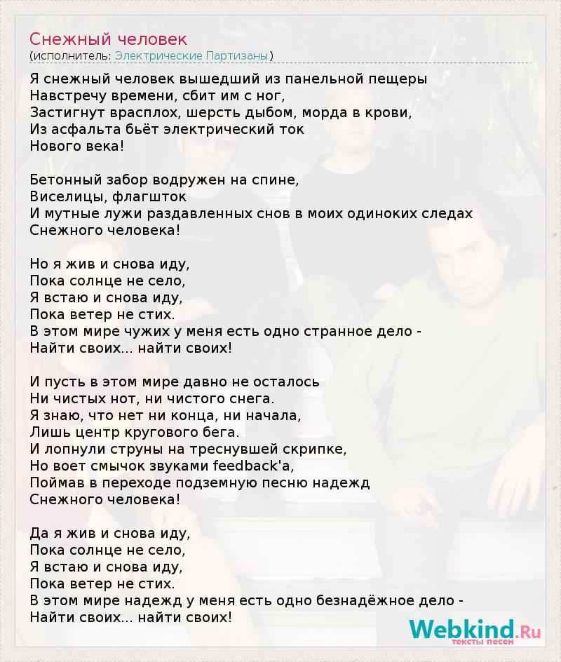 Я снежный человек вышедший из панельной пещеры Навстречу времени, сбит им с ног, Застигнут врасплох, шерсть дыбом, морда в крови, Из асфальта бьёт электрический ток Нового века! Бетонный забор водружен на спине, Виселицы, флагшток И мутные лужи раздавленных снов в моих одиноких следах Снежного человека! Но я жив и снова иду, Пока солнце не село, Я встаю и снова иду, Пока ветер не стих. В этом мире чужих у меня есть одно странное дело - Найти своих... найти своих! И пусть в этом мире давно не осталось Ни чистых нот, ни чистого снега. Я знаю, что нет ни конца, ни начала, Лишь центр кругового бега. И лопнули струны на треснувшей скрипке, Но воет смычок звуками feedback'а, Поймав в переходе подземную песню надежд Снежного человека! Да я жив и снова иду, Пока солнце не село, Я встаю и снова иду, Пока ветер не стих. В этом мире надежд у меня есть одно безнадёжное дело - Найти своих... найти своих!