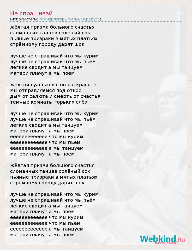 жёлтая призма больного счастья сломанных танцев солёный сок пьяные призраки в мятых платьях стрёмному городу дарят шок лучше не спрашивай что мы курим лучше не спрашивай что мы пьём лёгкие сводит а мы танцуем матери плачут а мы поём жёлтой гуашью вагон раскрасьте мы отправляемся под откос дым от салюта и смерть от счастья тёмные комнаты горьких слёз лучше не спрашивай что мы курим лучше не спрашивай что мы пьём лёгкие сводит а мы танцуем матери плачут а мы поём еееееееееееее что мы курим еееееееееееее что мы пьём еееееееееееее а мы танцуем матери плачут а мы поём жёлтая призма больного счастья сломанных танцев солёный сок пьяные призраки в мятых платьях стрёмному городу дарят шок лучше не спрашивай что мы курим лучше не спрашивай что мы пьём лёгкие сводит а мы танцуем матери плачут а мы поём еееееееееееее что мы курим еееееееееееее что мы пьём еееееееееееее а мы танцуем матери плачут а мы поём