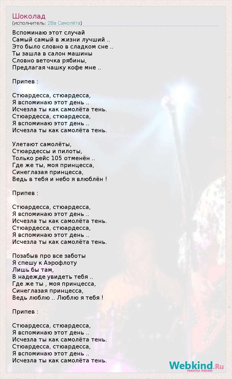 Вспоминаю этот случай Самый самый в жизни лучший .. Это было словно в сладком сне .. Ты зашла в салон машины Словно веточка рябины, Предлагая чашку кофе мне .. Припев : Стюардесса, стюардесса, Я вспоминаю этот день .. Исчезла ты как самолёта тень. Стюардесса, стюардесса, Я вспоминаю этот день .. Исчезла ты как самолёта тень. Улетают самолёты, Стюардессы и пилоты, Только рейс 105 отменён .. Где же ты, моя принцесса, Синеглазая принцесса, Ведь в тебя и небо я влюблён ! Припев : Стюардесса, стюардесса, Я вспоминаю этот день .. Исчезла ты как самолёта тень. Стюардесса, стюардесса, Я вспоминаю этот день .. Исчезла ты как самолёта тень. Позабыв про все заботы Я спешу к Аэрофлоту Лишь бы там, В надежде увидеть тебя .. Где же ты , моя принцесса, Синеглазая принцесса, Ведь люблю .. Люблю я тебя ! Припев : Стюардесса, стюардесса, Я вспоминаю этот день .. Исчезла ты как самолёта тень. Стюардесса, стюардесса, Я вспоминаю этот день .. Исчезла ты как самолёта тень.