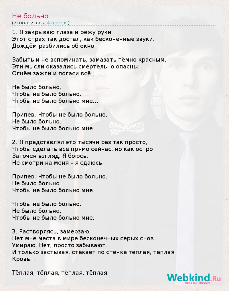 1. Я закрываю глаза и режу руки Этот страх так достал, как бесконечные звуки. Дождём разбились об окно. Забыть и не вспоминать, замазать тёмно красным. Эти мысли оказались смертельно опасны. Огнём зажги и погаси всё. Не было больно, Чтобы не было больно. Чтобы не было больно мне… Припев: Чтобы не было больно. Не было больно. Чтобы не было больно мне. 2. Я представлял это тысячи раз так просто, Чтобы сделать всё прямо сейчас, но как остро Заточен взгляд. Я боюсь. Не смотри на меня – я сдаюсь. Припев: Чтобы не было больно. Не было больно. Чтобы не было больно мне. Чтобы не было больно. Не было больно. Чтобы не было больно мне. 3. Растворяясь, замерзаю. Нет мне места в мире бесконечных серых снов. Умираю. Нет, просто забывают. И только застывая, стекает по стенке теплая, теплая Кровь… Тёплая, тёплая, тёплая, тёплая…