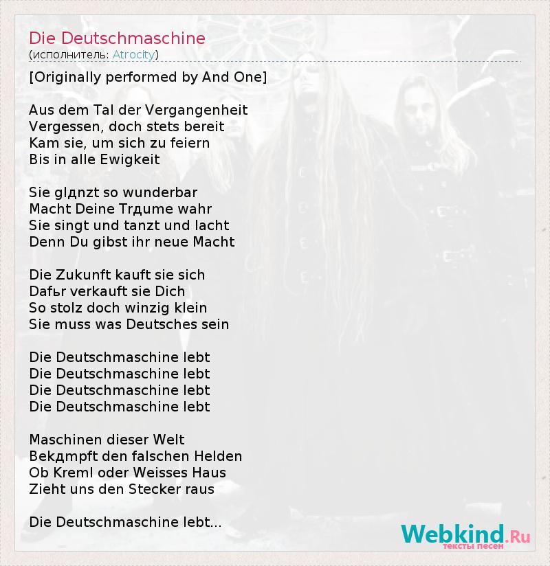 [Originally performed by And One] Aus dem Tal der Vergangenheit Vergessen, doch stets bereit Kam sie, um sich zu feiern Bis in alle Ewigkeit Sie glдnzt so wunderbar Macht Deine Trдume wahr Sie singt und tanzt und lacht Denn Du gibst ihr neue Macht Die Zukunft kauft sie sich Dafьr verkauft sie Dich So stolz doch winzig klein Sie muss was Deutsches sein Die Deutschmaschine lebt Die Deutschmaschine lebt Die Deutschmaschine lebt Die Deutschmaschine lebt Maschinen dieser Welt Bekдmpft den falschen Helden Ob Kreml oder Weisses Haus Zieht uns den Stecker raus Die Deutschmaschine lebt...
