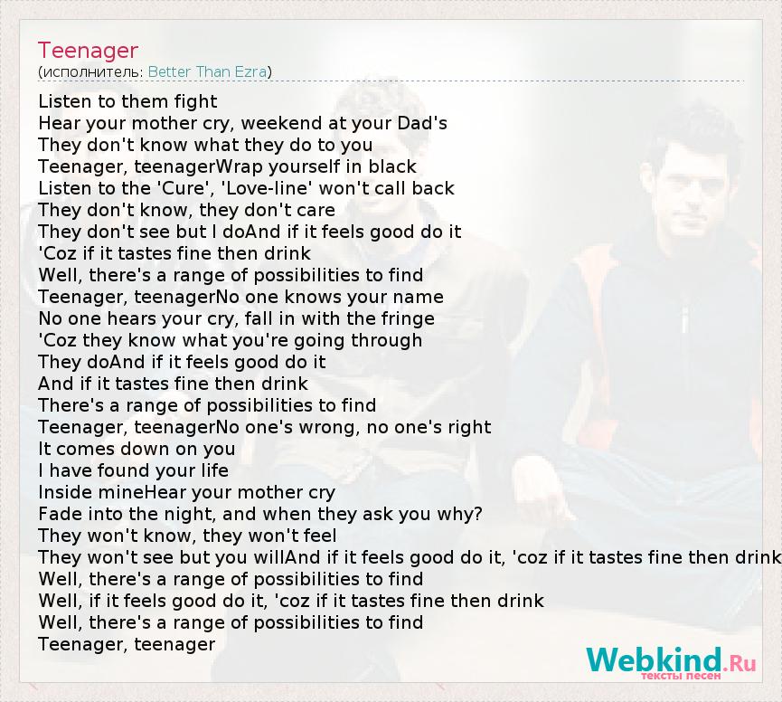 Listen to them fight Hear your mother cry, weekend at your Dad's They don't know what they do to you Teenager, teenagerWrap yourself in black Listen to the 'Cure', 'Love-line' won't call back They don't know, they don't care They don't see but I doAnd if it feels good do it 'Coz if it tastes fine then drink Well, there's a range of possibilities to find Teenager, teenagerNo one knows your name No one hears your cry, fall in with the fringe 'Coz they know what you're going through They doAnd if it feels good do it And if it tastes fine then drink There's a range of possibilities to find Teenager, teenagerNo one's wrong, no one's right It comes down on you I have found your life Inside mineHear your mother cry Fade into the night, and when they ask you why? They won't know, they won't feel They won't see but you willAnd if it feels good do it, 'coz if it tastes fine then drink Well, there's a range of possibilities to find Well, if it feels good do it, 'coz if it tastes fine then drink Well, there's a range of possibilities to find Teenager, teenager