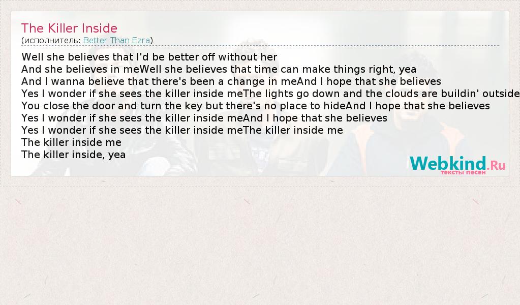 Well she believes that I'd be better off without her And she believes in meWell she believes that time can make things right, yea And I wanna believe that there's been a change in meAnd I hope that she believes Yes I wonder if she sees the killer inside meThe lights go down and the clouds are buildin' outside You close the door and turn the key but there's no place to hideAnd I hope that she believes Yes I wonder if she sees the killer inside meAnd I hope that she believes Yes I wonder if she sees the killer inside meThe killer inside me The killer inside me The killer inside, yea