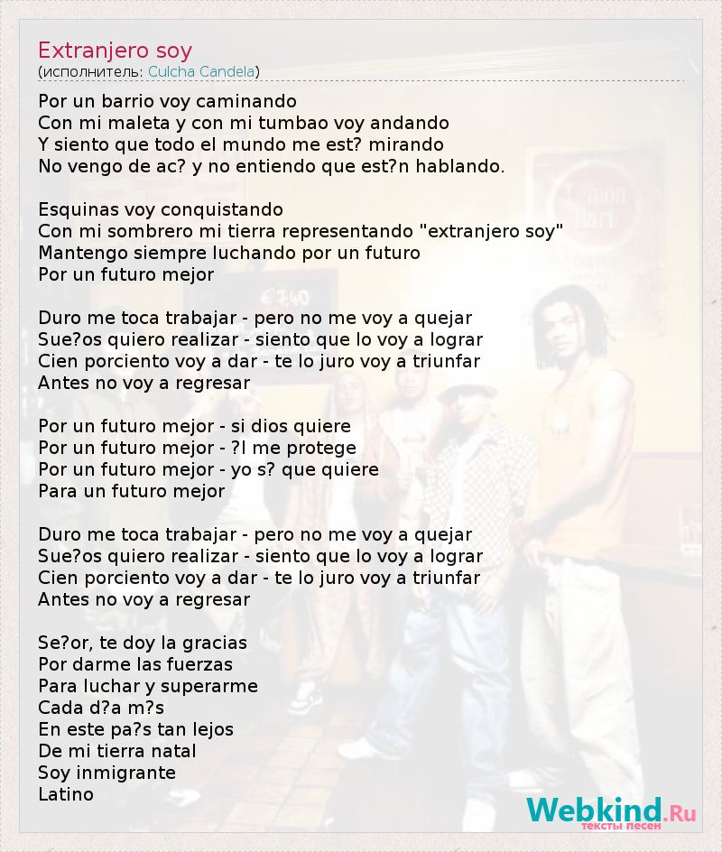 Por un barrio voy caminando Con mi maleta y con mi tumbao voy andando Y siento que todo el mundo me est? mirando No vengo de ac? y no entiendo que est?n hablando. Esquinas voy conquistando Con mi sombrero mi tierra representando "extranjero soy" Mantengo siempre luchando por un futuro Por un futuro mejor Duro me toca trabajar - pero no me voy a quejar Sue?os quiero realizar - siento que lo voy a lograr Cien porciento voy a dar - te lo juro voy a triunfar Antes no voy a regresar Por un futuro mejor - si dios quiere Por un futuro mejor - ?l me protege Por un futuro mejor - yo s? que quiere Para un futuro mejor Duro me toca trabajar - pero no me voy a quejar Sue?os quiero realizar - siento que lo voy a lograr Cien porciento voy a dar - te lo juro voy a triunfar Antes no voy a regresar Se?or, te doy la gracias Por darme las fuerzas Para luchar y superarme Cada d?a m?s En este pa?s tan lejos De mi tierra natal Soy inmigrante Latino