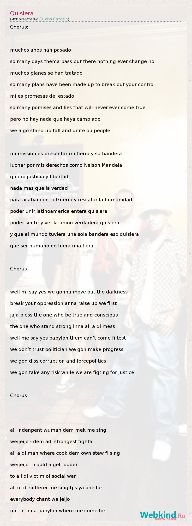 Chorus: muchos años han pasado so many days thema pass but there nothing ever change no muchos planes se han tratado so many plans have been made up to break out your control miles promesas del estado so many pomises and lies that will never ever come true pero no hay nada que haya cambiado we a go stand up tall and unite ou people mi mission es presentar mi tierra y su bandera luchar por mis derechos como Nelson Mandela quiero justicia y libertad nada mas que la verdad para acabar con la Guerra y rescatar la humanidad poder unir latinoamerica entera quisiera poder sentir y ver la union verdadera quisiera y que el mundo tuviera una sola bandera eso quisiera que ser humano no fuera una fiera Chorus well mi say yes we gonna move out the darkness break your oppression anna raise up we first jaja bless the one who be true and conscious the one who stand strong inna all a di mess well me say yes babylon them can’t come fi test we don’t trust politician we gon make progress we gon diss corruption and forcepolitics we gon take any risk while we are figting for justice Chorus all indenpent wuman dem mek me sing weijeijo - dem adi strongest fighta all a di man where cook dem own stew fi sing weijeijo – could a get louder to all di victim of social war all of di sufferer me sing tjis ya one for everybody chant weijeijo nuttin inna babylon where me come for