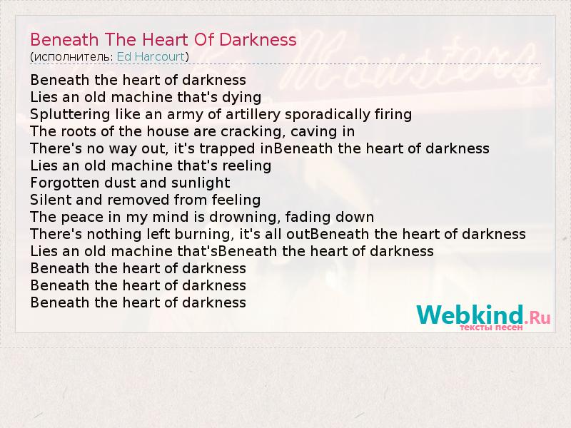 Beneath the heart of darkness Lies an old machine that's dying Spluttering like an army of artillery sporadically firing The roots of the house are cracking, caving in There's no way out, it's trapped inBeneath the heart of darkness Lies an old machine that's reeling Forgotten dust and sunlight Silent and removed from feeling The peace in my mind is drowning, fading down There's nothing left burning, it's all outBeneath the heart of darkness Lies an old machine that'sBeneath the heart of darkness Beneath the heart of darkness Beneath the heart of darkness Beneath the heart of darkness