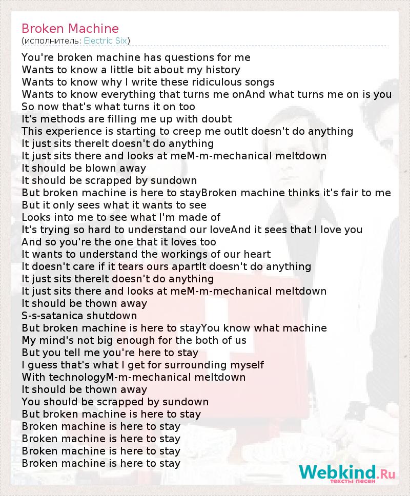 You're broken machine has questions for me Wants to know a little bit about my history Wants to know why I write these ridiculous songs Wants to know everything that turns me onAnd what turns me on is you So now that's what turns it on too It's methods are filling me up with doubt This experience is starting to creep me outIt doesn't do anything It just sits thereIt doesn't do anything It just sits there and looks at meM-m-mechanical meltdown It should be blown away It should be scrapped by sundown But broken machine is here to stayBroken machine thinks it's fair to me But it only sees what it wants to see Looks into me to see what I'm made of It's trying so hard to understand our loveAnd it sees that I love you And so you're the one that it loves too It wants to understand the workings of our heart It doesn't care if it tears ours apartIt doesn't do anything It just sits thereIt doesn't do anything It just sits there and looks at meM-m-mechanical meltdown It should be thown away S-s-satanica shutdown But broken machine is here to stayYou know what machine My mind's not big enough for the both of us But you tell me you're here to stay I guess that's what I get for surrounding myself With technologyM-m-mechanical meltdown It should be thown away You should be scrapped by sundown But broken machine is here to stay Broken machine is here to stay Broken machine is here to stay Broken machine is here to stay Broken machine is here to stay