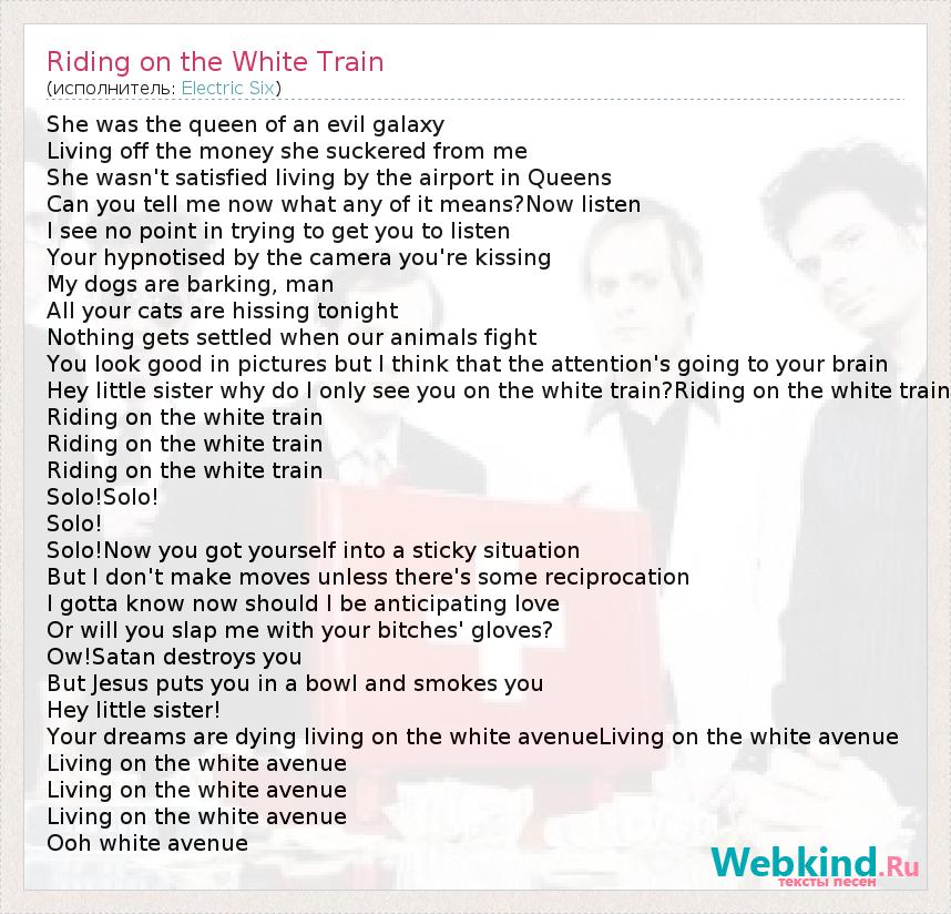 She was the queen of an evil galaxy Living off the money she suckered from me She wasn't satisfied living by the airport in Queens Can you tell me now what any of it means?Now listen I see no point in trying to get you to listen Your hypnotised by the camera you're kissing My dogs are barking, man All your cats are hissing tonight Nothing gets settled when our animals fight You look good in pictures but I think that the attention's going to your brain Hey little sister why do I only see you on the white train?Riding on the white train Riding on the white train Riding on the white train Riding on the white train Solo!Solo! Solo! Solo!Now you got yourself into a sticky situation But I don't make moves unless there's some reciprocation I gotta know now should I be anticipating love Or will you slap me with your bitches' gloves? Ow!Satan destroys you But Jesus puts you in a bowl and smokes you Hey little sister! Your dreams are dying living on the white avenueLiving on the white avenue Living on the white avenue Living on the white avenue Living on the white avenue Ooh white avenue