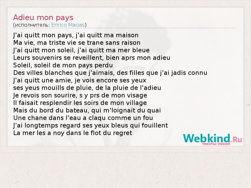J'ai quitt mon pays, j'ai quitt ma maison Ma vie, ma triste vie se trane sans raison J'ai quitt mon soleil, j'ai quitt ma mer bleue Leurs souvenirs se reveillent, bien aprs mon adieu Soleil, soleil de mon pays perdu Des villes blanches que j'aimais, des filles que j'ai jadis connu J'ai quitt une amie, je vois encore ses yeux ses yeus mouills de pluie, de la pluie de l'adieu Je revois son sourire, s y prs de mon visage Il faisait resplendir les soirs de mon village Mais du bord du bateau, qui m'loignait du quai Une chane dans l'eau a claqu comme un fou J'ai longtemps regard ses yeux bleus qui fouillent La mer les a noy dans le flot du regret