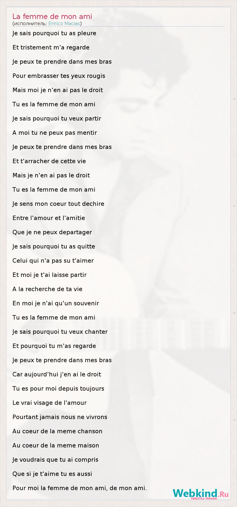 Je sais pourquoi tu as pleure Et tristement m'a regarde Je peux te prendre dans mes bras Pour embrasser tes yeux rougis Mais moi je n'en ai pas le droit Tu es la femme de mon ami Je sais pourquoi tu veux partir A moi tu ne peux pas mentir Je peux te prendre dans mes bras Et t'arracher de cette vie Mais je n'en ai pas le droit Tu es la femme de mon ami Je sens mon coeur tout dechire Entre l'amour et l'amitie Que je ne peux departager Je sais pourquoi tu as quitte Celui qui n'a pas su t'aimer Et moi je t'ai laisse partir A la recherche de ta vie En moi je n'ai qu'un souvenir Tu es la femme de mon ami Je sais pourquoi tu veux chanter Et pourquoi tu m'as regarde Je peux te prendre dans mes bras Car aujourd'hui j'en ai le droit Tu es pour moi depuis toujours Le vrai visage de l'amour Pourtant jamais nous ne vivrons Au coeur de la meme chanson Au coeur de la meme maison Je voudrais que tu ai compris Que si je t'aime tu es aussi Pour moi la femme de mon ami, de mon ami.