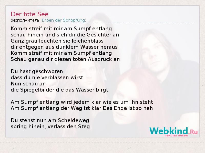 Komm streif mit mir am Sumpf entlang schau hinein und sieh dir die Gesichter an Ganz grau leuchten sie leichenblass dir entgegen aus dunklem Wasser heraus Komm streif mit mir am Sumpf entlang Schau genau dir diesen toten Ausdruck an Du hast geschworen dass du nie verblassen wirst Nun schau an die Spiegelbilder die das Wasser birgt Am Sumpf entlang wird jedem klar wie es um ihn steht Am Sumpf entlang der Weg ist klar Das Ende ist so nah Du stehst nun am Scheideweg spring hinein, verlass den Steg