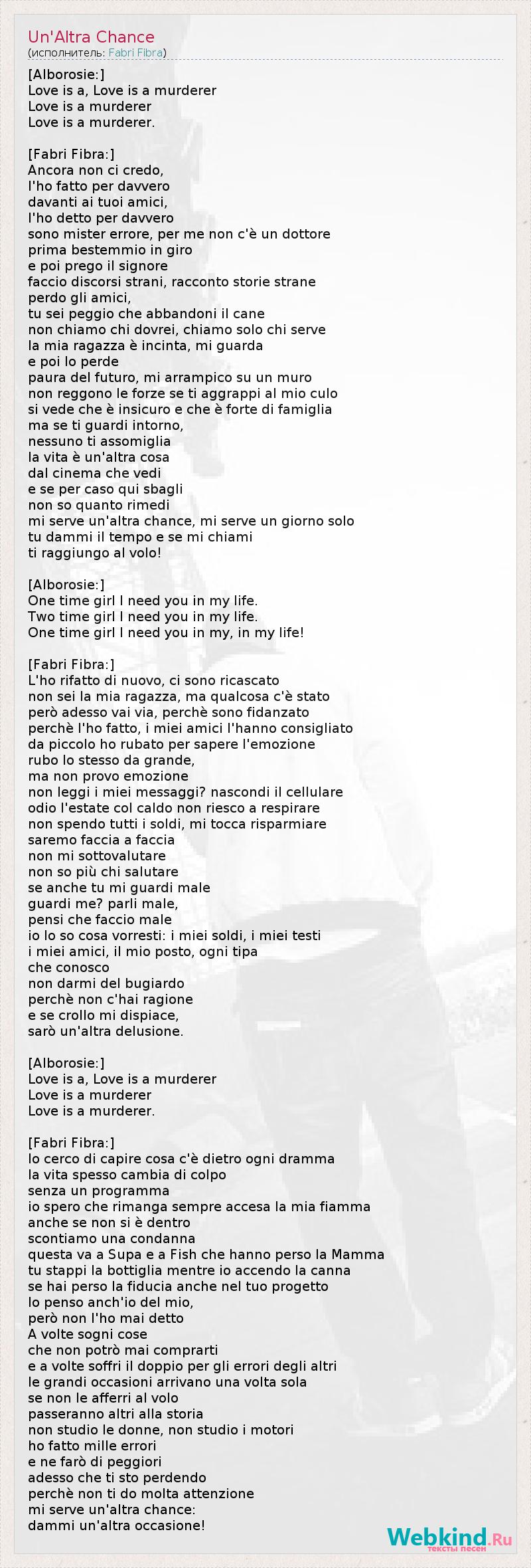 [Alborosie:] Love is a, Love is a murderer Love is a murderer Love is a murderer. [Fabri Fibra:] Ancora non ci credo, l'ho fatto per davvero davanti ai tuoi amici, l'ho detto per davvero sono mister errore, per me non c'è un dottore prima bestemmio in giro e poi prego il signore faccio discorsi strani, racconto storie strane perdo gli amici, tu sei peggio che abbandoni il cane non chiamo chi dovrei, chiamo solo chi serve la mia ragazza è incinta, mi guarda e poi lo perde paura del futuro, mi arrampico su un muro non reggono le forze se ti aggrappi al mio culo si vede che è insicuro e che è forte di famiglia ma se ti guardi intorno, nessuno ti assomiglia la vita è un'altra cosa dal cinema che vedi e se per caso qui sbagli non so quanto rimedi mi serve un'altra chance, mi serve un giorno solo tu dammi il tempo e se mi chiami ti raggiungo al volo! [Alborosie:] One time girl I need you in my life. Two time girl I need you in my life. One time girl I need you in my, in my life! [Fabri Fibra:] L'ho rifatto di nuovo, ci sono ricascato non sei la mia ragazza, ma qualcosa c'è stato però adesso vai via, perchè sono fidanzato perchè l'ho fatto, i miei amici l'hanno consigliato da piccolo ho rubato per sapere l'emozione rubo lo stesso da grande, ma non provo emozione non leggi i miei messaggi? nascondi il cellulare odio l'estate col caldo non riesco a respirare non spendo tutti i soldi, mi tocca risparmiare saremo faccia a faccia non mi sottovalutare non so più chi salutare se anche tu mi guardi male guardi me? parli male, pensi che faccio male io lo so cosa vorresti: i miei soldi, i miei testi i miei amici, il mio posto, ogni tipa che conosco non darmi del bugiardo perchè non c'hai ragione e se crollo mi dispiace, sarò un'altra delusione. [Alborosie:] Love is a, Love is a murderer Love is a murderer Love is a murderer. [Fabri Fibra:] Io cerco di capire cosa c'è dietro ogni dramma la vita spesso cambia di colpo senza un programma io spero che rimanga sempre accesa la mia fiamma anche se non si è dentro scontiamo una condanna questa va a Supa e a Fish che hanno perso la Mamma tu stappi la bottiglia mentre io accendo la canna se hai perso la fiducia anche nel tuo progetto lo penso anch'io del mio, però non l'ho mai detto A volte sogni cose che non potrò mai comprarti e a volte soffri il doppio per gli errori degli altri le grandi occasioni arrivano una volta sola se non le afferri al volo passeranno altri alla storia non studio le donne, non studio i motori ho fatto mille errori e ne farò di peggiori adesso che ti sto perdendo perchè non ti do molta attenzione mi serve un'altra chance: dammi un'altra occasione!