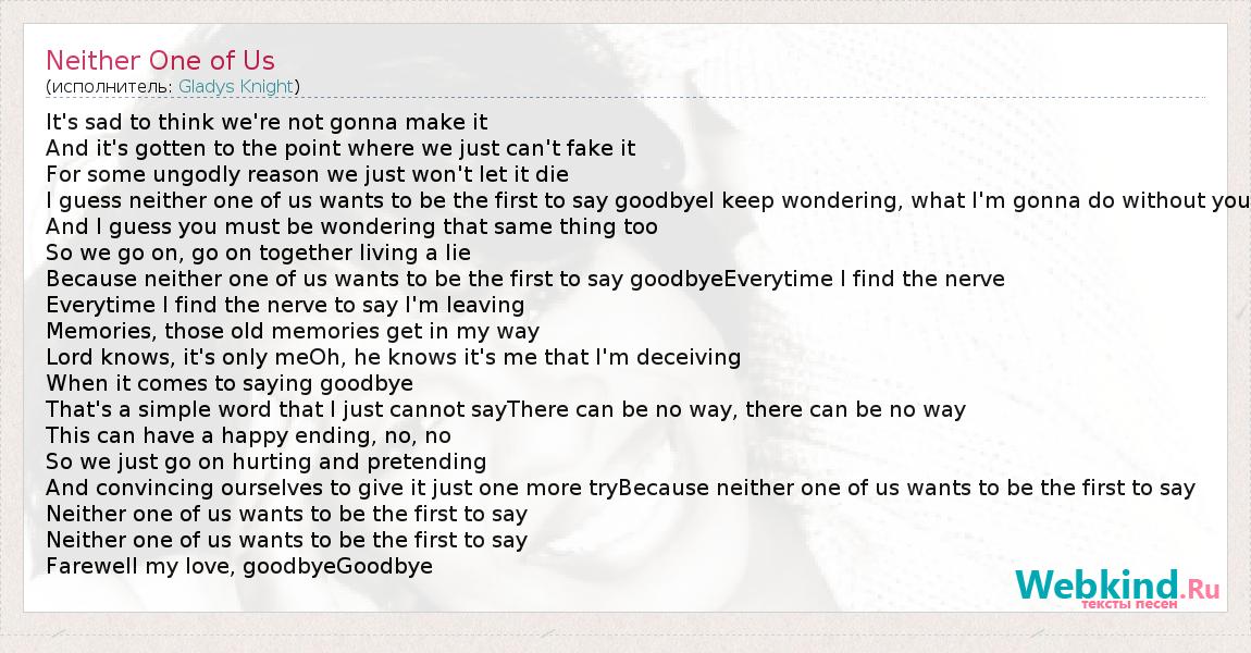 It's sad to think we're not gonna make it And it's gotten to the point where we just can't fake it For some ungodly reason we just won't let it die I guess neither one of us wants to be the first to say goodbyeI keep wondering, what I'm gonna do without you And I guess you must be wondering that same thing too So we go on, go on together living a lie Because neither one of us wants to be the first to say goodbyeEverytime I find the nerve Everytime I find the nerve to say I'm leaving Memories, those old memories get in my way Lord knows, it's only meOh, he knows it's me that I'm deceiving When it comes to saying goodbye That's a simple word that I just cannot sayThere can be no way, there can be no way This can have a happy ending, no, no So we just go on hurting and pretending And convincing ourselves to give it just one more tryBecause neither one of us wants to be the first to say Neither one of us wants to be the first to say Neither one of us wants to be the first to say Farewell my love, goodbyeGoodbye