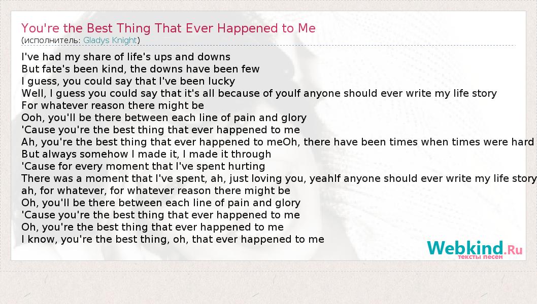 I've had my share of life's ups and downs But fate's been kind, the downs have been few I guess, you could say that I've been lucky Well, I guess you could say that it's all because of youIf anyone should ever write my life story For whatever reason there might be Ooh, you'll be there between each line of pain and glory 'Cause you're the best thing that ever happened to me Ah, you're the best thing that ever happened to meOh, there have been times when times were hard But always somehow I made it, I made it through 'Cause for every moment that I've spent hurting There was a moment that I've spent, ah, just loving you, yeahIf anyone should ever write my life story ah, for whatever, for whatever reason there might be Oh, you'll be there between each line of pain and glory 'Cause you're the best thing that ever happened to me Oh, you're the best thing that ever happened to me I know, you're the best thing, oh, that ever happened to me