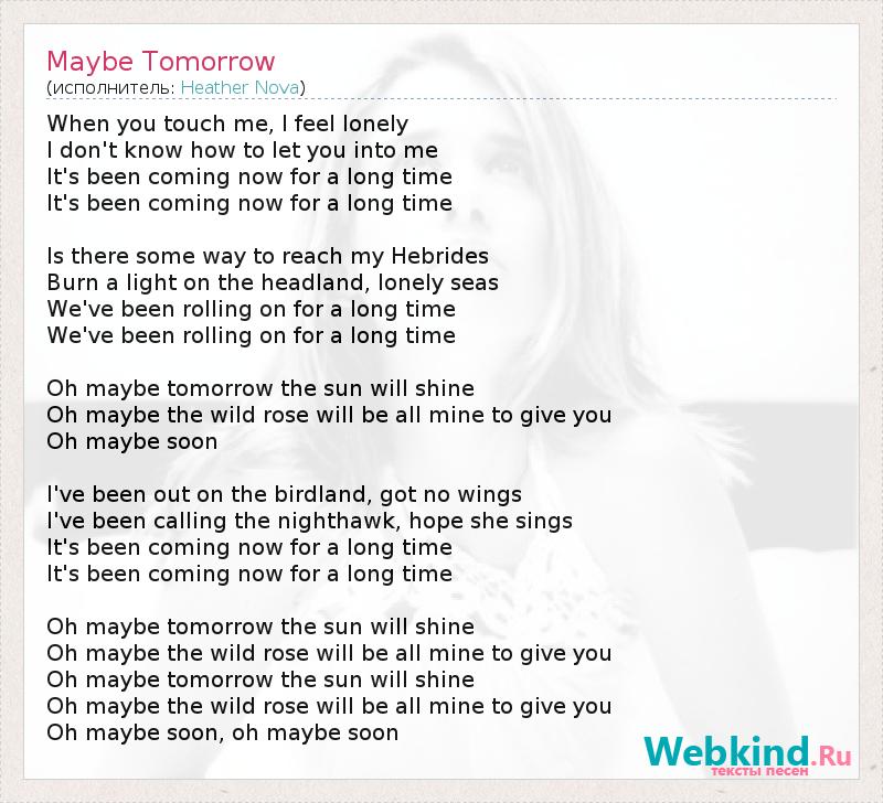 When you touch me, I feel lonely I don't know how to let you into me It's been coming now for a long time It's been coming now for a long time Is there some way to reach my Hebrides Burn a light on the headland, lonely seas We've been rolling on for a long time We've been rolling on for a long time Oh maybe tomorrow the sun will shine Oh maybe the wild rose will be all mine to give you Oh maybe soon I've been out on the birdland, got no wings I've been calling the nighthawk, hope she sings It's been coming now for a long time It's been coming now for a long time Oh maybe tomorrow the sun will shine Oh maybe the wild rose will be all mine to give you Oh maybe tomorrow the sun will shine Oh maybe the wild rose will be all mine to give you Oh maybe soon, oh maybe soon