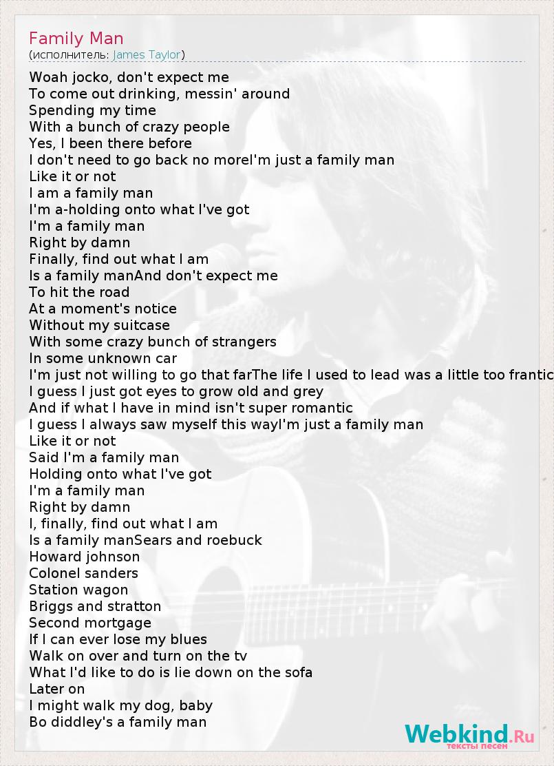 Woah jocko, don't expect me To come out drinking, messin' around Spending my time With a bunch of crazy people Yes, I been there before I don't need to go back no moreI'm just a family man Like it or not I am a family man I'm a-holding onto what I've got I'm a family man Right by damn Finally, find out what I am Is a family manAnd don't expect me To hit the road At a moment's notice Without my suitcase With some crazy bunch of strangers In some unknown car I'm just not willing to go that farThe life I used to lead was a little too frantic I guess I just got eyes to grow old and grey And if what I have in mind isn't super romantic I guess I always saw myself this wayI'm just a family man Like it or not Said I'm a family man Holding onto what I've got I'm a family man Right by damn I, finally, find out what I am Is a family manSears and roebuck Howard johnson Colonel sanders Station wagon Briggs and stratton Second mortgage If I can ever lose my blues Walk on over and turn on the tv What I'd like to do is lie down on the sofa Later on I might walk my dog, baby Bo diddley's a family man