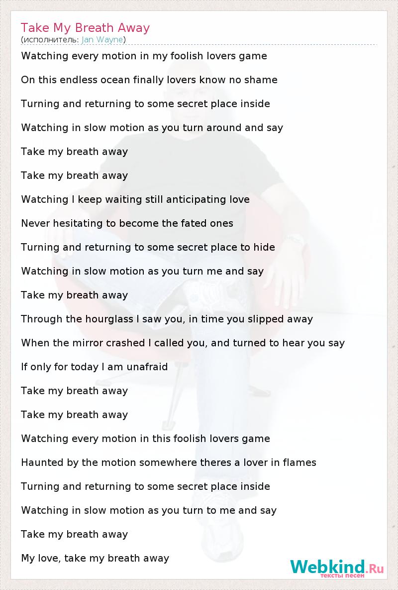 Watching every motion in my foolish lovers game On this endless ocean finally lovers know no shame Turning and returning to some secret place inside Watching in slow motion as you turn around and say Take my breath away Take my breath away Watching I keep waiting still anticipating love Never hesitating to become the fated ones Turning and returning to some secret place to hide Watching in slow motion as you turn me and say Take my breath away Through the hourglass I saw you, in time you slipped away When the mirror crashed I called you, and turned to hear you say If only for today I am unafraid Take my breath away Take my breath away Watching every motion in this foolish lovers game Haunted by the motion somewhere theres a lover in flames Turning and returning to some secret place inside Watching in slow motion as you turn to me and say Take my breath away My love, take my breath away