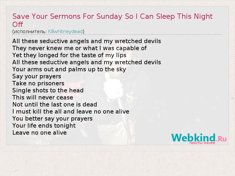 ГлавнаяИсполнителиKillwhitneydeadSave Your Sermons For Sunday So I Can Sleep This Night Off