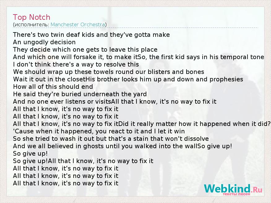 There's two twin deaf kids and they've gotta make An ungodly decision They decide which one gets to leave this place And which one will forsake it, to make itSo, the first kid says in his temporal tone I don't think there's a way to resolve this We should wrap up these towels round our blisters and bones Wait it out in the closetHis brother looks him up and down and prophesies How all of this should end He said they're buried underneath the yard And no one ever listens or visitsAll that I know, it's no way to fix it All that I know, it's no way to fix it All that I know, it's no way to fix it All that I know, it's no way to fix itDid it really matter how it happened when it did? 'Cause when it happened, you react to it and I let it win So she tried to wash it out but that's a stain that won't dissolve And we all believed in ghosts until you walked into the wallSo give up! So give up! So give up!All that I know, it's no way to fix it All that I know, it's no way to fix it All that I know, it's no way to fix it All that I know, it's no way to fix it