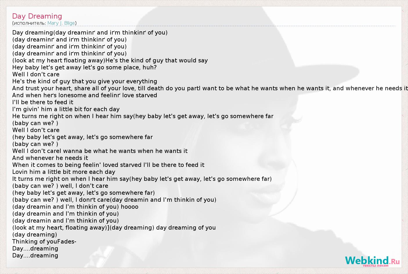 Day dreaming(day dreaminґ and iґm thinkinґ of you) (day dreaminґ and iґm thinkinґ of you) (day dreaminґ and iґm thinkinґ of you) (day dreaminґ and iґm thinkinґ of you) (look at my heart floating away)He's the kind of guy that would say Hey baby let's get away let's go some place, huh? Well I don't care He's the kind of guy that you give your everything And trust your heart, share all of your love, till death do you partI want to be what he wants when he wants it, and whenever he needs it And when heґs lonesome and feelinґ love starved I'll be there to feed it I'm givin' him a little bit for each day He turns me right on when I hear him say(hey baby let's get away, let's go somewhere far (baby can we? ) Well I don't care (hey baby let's get away, let's go somewhere far (baby can we? ) Well I don't careI wanna be what he wants when he wants it And whenever he needs it When it comes to being feelin' loved starved I'll be there to feed it Lovin him a little bit more each day It turns me right on when I hear him say(hey baby let's get away, let's go somewhere far) (baby can we? ) well, I don't care (hey baby let's get away, let's go somewhere far) (baby can we? ) well, I donґt care(day dreamin and I'm thinkin of you) (day dreamin and I'm thinkin of you) hoooo (day dreamin and I'm thinkin of you) (day dreamin and I'm thinkin of you) (look at my heart, floating away)](day dreaming) day dreaming of you (day dreaming) Thinking of youFades- Day....dreaming Day....dreaming