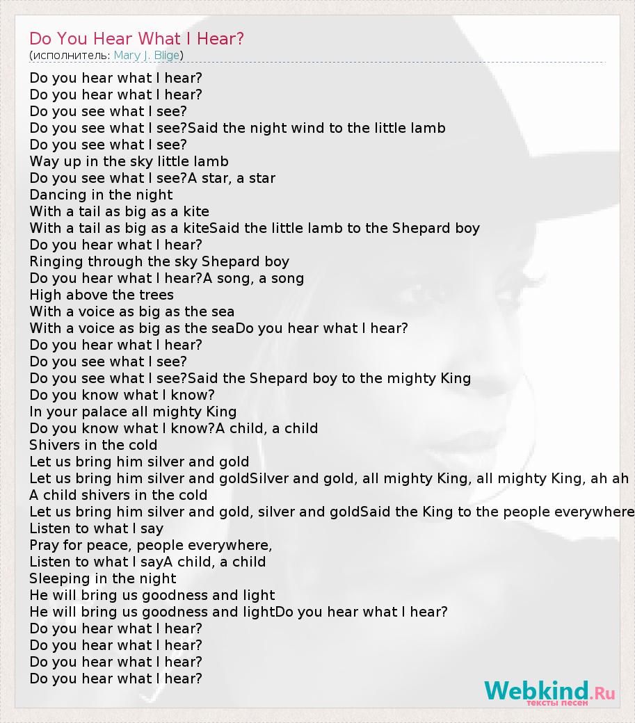 Do you hear what I hear? Do you hear what I hear? Do you see what I see? Do you see what I see?Said the night wind to the little lamb Do you see what I see? Way up in the sky little lamb Do you see what I see?A star, a star Dancing in the night With a tail as big as a kite With a tail as big as a kiteSaid the little lamb to the Shepard boy Do you hear what I hear? Ringing through the sky Shepard boy Do you hear what I hear?A song, a song High above the trees With a voice as big as the sea With a voice as big as the seaDo you hear what I hear? Do you hear what I hear? Do you see what I see? Do you see what I see?Said the Shepard boy to the mighty King Do you know what I know? In your palace all mighty King Do you know what I know?A child, a child Shivers in the cold Let us bring him silver and gold Let us bring him silver and goldSilver and gold, all mighty King, all mighty King, ah ah A child shivers in the cold Let us bring him silver and gold, silver and goldSaid the King to the people everywhere Listen to what I say Pray for peace, people everywhere, Listen to what I sayA child, a child Sleeping in the night He will bring us goodness and light He will bring us goodness and lightDo you hear what I hear? Do you hear what I hear? Do you hear what I hear? Do you hear what I hear? Do you hear what I hear?