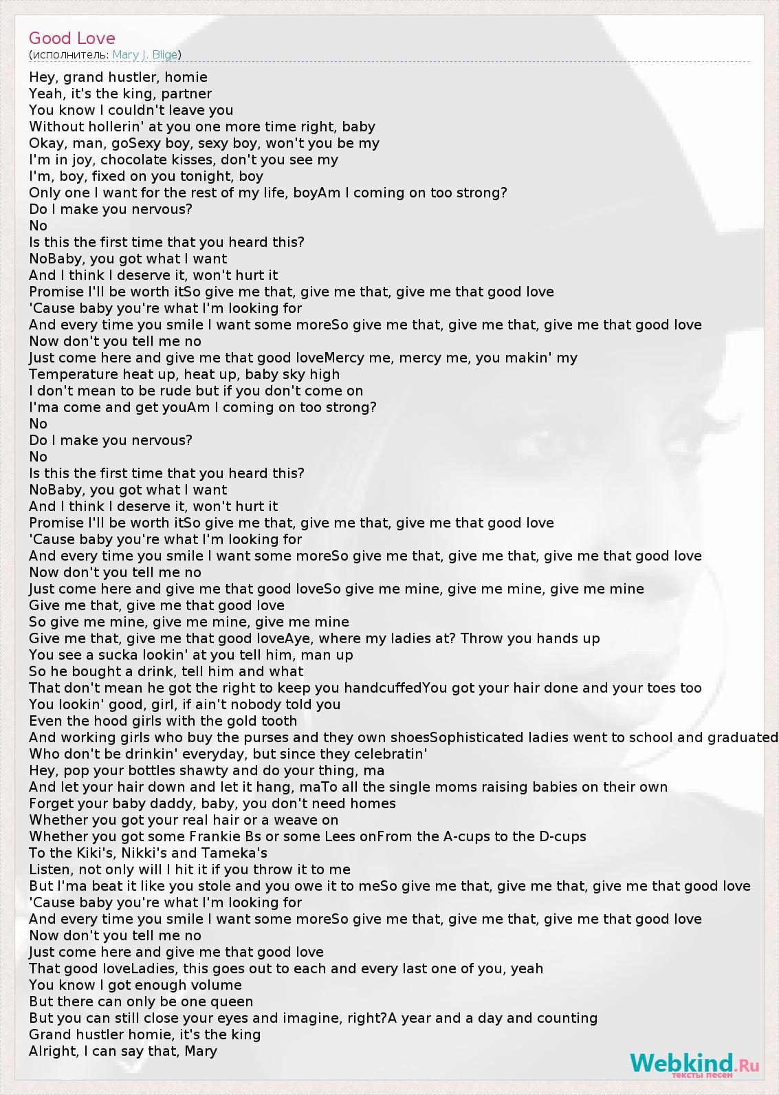 Hey, grand hustler, homie Yeah, it's the king, partner You know I couldn't leave you Without hollerin' at you one more time right, baby Okay, man, goSexy boy, sexy boy, won't you be my I'm in joy, chocolate kisses, don't you see my I'm, boy, fixed on you tonight, boy Only one I want for the rest of my life, boyAm I coming on too strong? Do I make you nervous? No Is this the first time that you heard this? NoBaby, you got what I want And I think I deserve it, won't hurt it Promise I'll be worth itSo give me that, give me that, give me that good love 'Cause baby you're what I'm looking for And every time you smile I want some moreSo give me that, give me that, give me that good love Now don't you tell me no Just come here and give me that good loveMercy me, mercy me, you makin' my Temperature heat up, heat up, baby sky high I don't mean to be rude but if you don't come on I'ma come and get youAm I coming on too strong? No Do I make you nervous? No Is this the first time that you heard this? NoBaby, you got what I want And I think I deserve it, won't hurt it Promise I'll be worth itSo give me that, give me that, give me that good love 'Cause baby you're what I'm looking for And every time you smile I want some moreSo give me that, give me that, give me that good love Now don't you tell me no Just come here and give me that good loveSo give me mine, give me mine, give me mine Give me that, give me that good love So give me mine, give me mine, give me mine Give me that, give me that good loveAye, where my ladies at? Throw you hands up You see a sucka lookin' at you tell him, man up So he bought a drink, tell him and what That don't mean he got the right to keep you handcuffedYou got your hair done and your toes too You lookin' good, girl, if ain't nobody told you Even the hood girls with the gold tooth And working girls who buy the purses and they own shoesSophisticated ladies went to school and graduated Who don't be drinkin' everyday, but since they celebratin' Hey, pop your bottles shawty and do your thing, ma And let your hair down and let it hang, maTo all the single moms raising babies on their own Forget your baby daddy, baby, you don't need homes Whether you got your real hair or a weave on Whether you got some Frankie Bs or some Lees onFrom the A-cups to the D-cups To the Kiki's, Nikki's and Tameka's Listen, not only will I hit it if you throw it to me But I'ma beat it like you stole and you owe it to meSo give me that, give me that, give me that good love 'Cause baby you're what I'm looking for And every time you smile I want some moreSo give me that, give me that, give me that good love Now don't you tell me no Just come here and give me that good love That good loveLadies, this goes out to each and every last one of you, yeah You know I got enough volume But there can only be one queen But you can still close your eyes and imagine, right?A year and a day and counting Grand hustler homie, it's the king Alright, I can say that, Mary