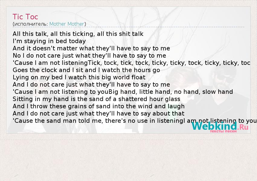 All this talk, all this ticking, all this shit talk I'm staying in bed today And it doesn't matter what they'll have to say to me No I do not care just what they'll have to say to me 'Cause I am not listeningTick, tock, tick, tock, ticky, ticky, tock, ticky, ticky, toc Goes the clock and I sit and I watch the hours go Lying on my bed I watch this big world float And I do not care just what they'll have to say to me 'Cause I am not listening to youBig hand, little hand, no hand, slow hand Sitting in my hand is the sand of a shattered hour glass And I throw these grains of sand into the wind and laugh And I do not care just what they'll have to say about that 'Cause the sand man told me, there's no use in listeningI am not listening to you