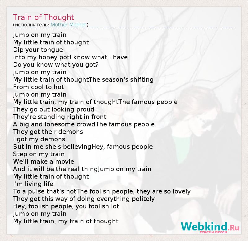 Jump on my train My little train of thought Dip your tongue Into my honey potI know what I have Do you know what you got? Jump on my train My little train of thoughtThe season's shifting From cool to hot Jump on my train My little train, my train of thoughtThe famous people They go out looking proud They're standing right in front A big and lonesome crowdThe famous people They got their demons I got my demons But in me she's believingHey, famous people Step on my train We'll make a movie And it will be the real thingJump on my train My little train of thought I'm living life To a pulse that's hotThe foolish people, they are so lovely They got this way of doing everything politely Hey, foolish people, you foolish lot Jump on my train My little train, my train of thought