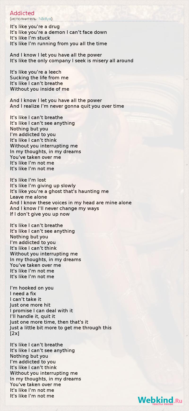 Ты действуешь на меня, как наркотик Ты как злой дух, которого я не могу отпугнуть, Я в тупике, Я будто все время убегаю от тебя Но я знаю, что дала тебе власть над собой Я как будто ищу страдания Ты будто кровопийца, Высасывающий из меня жизнь, Я перестаю дышать Без тебя Но я знаю, что дала тебе власть над собой Но я понимаю, что никогда не смогу выбросить тебя из головы Я не могу дышать, Я как будто ничего не вижу, Ничего, кроме тебя Я зависима от тебя У меня не работает голова, Когда тебя нет рядом И днем, и ночью Ты преследуешь меня Я – как будто не я, Я – как будто не я. Я обессилела, Я медленно сдаюсь, Ты как привидение, преследующее меня, Оставь меня в покое!! И я снова слышу эти голоса в голове, я остаюсь наедине с ними И я знаю, что так будет продолжаться до тех пор, Пока я не выброшу тебя из головы Я не могу дышать, Я как будто ничего не вижу, Ничего, кроме тебя, Я зависима от тебя, У меня не работает голова, Когда нет рядом тебя, И днем, и ночью Ты преследуешь меня, Я – как будто не я, Я – как будто не я. Я зависима от тебя, Мне надо раз и навсегда покончить с этим Я не смогу все время с этим бороться, Еще один удар, Я обещаю, я сделаю это, Я справлюсь, я стану свободна, Еще немного, и я смогу, Мне надо еще чуть-чуть, и я смогу (2 раза) Я не могу дышать, Я как будто ничего не вижу, Ничего, кроме тебя Я зависима от тебя У меня не работает голова, Когда тебя нет рядом И днем, и ночью Ты преследуешь меня Я – как будто не я, Я – как будто не я.