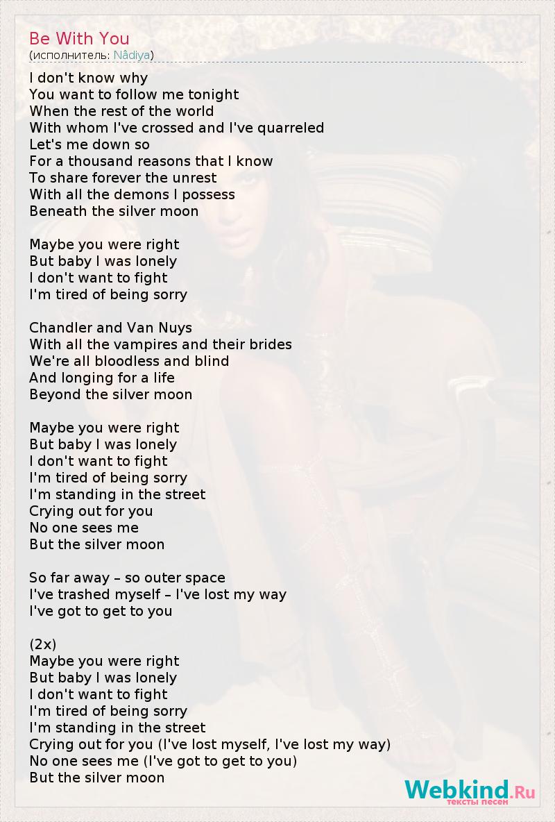 I don't know why You want to follow me tonight When the rest of the world With whom I've crossed and I've quarreled Let's me down so For a thousand reasons that I know To share forever the unrest With all the demons I possess Beneath the silver moon Maybe you were right But baby I was lonely I don't want to fight I'm tired of being sorry Chandler and Van Nuys With all the vampires and their brides We're all bloodless and blind And longing for a life Beyond the silver moon Maybe you were right But baby I was lonely I don't want to fight I'm tired of being sorry I'm standing in the street Crying out for you No one sees me But the silver moon So far away – so outer space I've trashed myself – I've lost my way I've got to get to you (2х) Maybe you were right But baby I was lonely I don't want to fight I'm tired of being sorry I'm standing in the street Crying out for you (I've lost myself, I've lost my way) No one sees me (I've got to get to you) But the silver moon