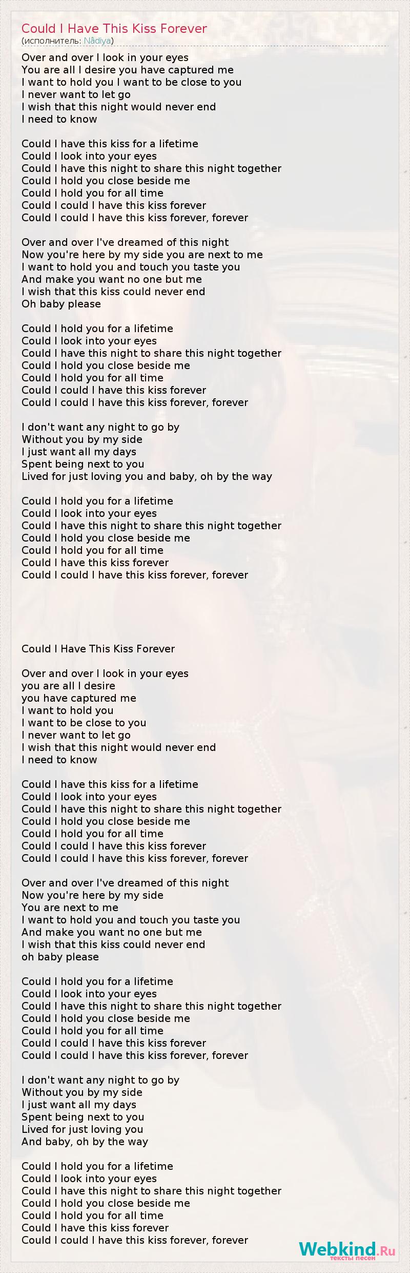 Over and over I look in your eyes You are all I desire you have captured me I want to hold you I want to be close to you I never want to let go I wish that this night would never end I need to know Could I have this kiss for a lifetime Could I look into your eyes Could I have this night to share this night together Could I hold you close beside me Could I hold you for all time Could I could I have this kiss forever Could I could I have this kiss forever, forever Over and over I've dreamed of this night Now you're here by my side you are next to me I want to hold you and touch you taste you And make you want no one but me I wish that this kiss could never end Oh baby please Could I hold you for a lifetime Could I look into your eyes Could I have this night to share this night together Could I hold you close beside me Could I hold you for all time Could I could I have this kiss forever Could I could I have this kiss forever, forever I don't want any night to go by Without you by my side I just want all my days Spent being next to you Lived for just loving you and baby, oh by the way Could I hold you for a lifetime Could I look into your eyes Could I have this night to share this night together Could I hold you close beside me Could I hold you for all time Could I have this kiss forever Could I could I have this kiss forever, forever Could I Have This Kiss Forever Over and over I look in your eyes you are all I desire you have captured me I want to hold you I want to be close to you I never want to let go I wish that this night would never end I need to know Could I have this kiss for a lifetime Could I look into your eyes Could I have this night to share this night together Could I hold you close beside me Could I hold you for all time Could I could I have this kiss forever Could I could I have this kiss forever, forever Over and over I've dreamed of this night Now you're here by my side You are next to me I want to hold you and touch you taste you And make you want no one but me I wish that this kiss could never end oh baby please Could I hold you for a lifetime Could I look into your eyes Could I have this night to share this night together Could I hold you close beside me Could I hold you for all time Could I could I have this kiss forever Could I could I have this kiss forever, forever I don't want any night to go by Without you by my side I just want all my days Spent being next to you Lived for just loving you And baby, oh by the way Could I hold you for a lifetime Could I look into your eyes Could I have this night to share this night together Could I hold you close beside me Could I hold you for all time Could I have this kiss forever Could I could I have this kiss forever, forever